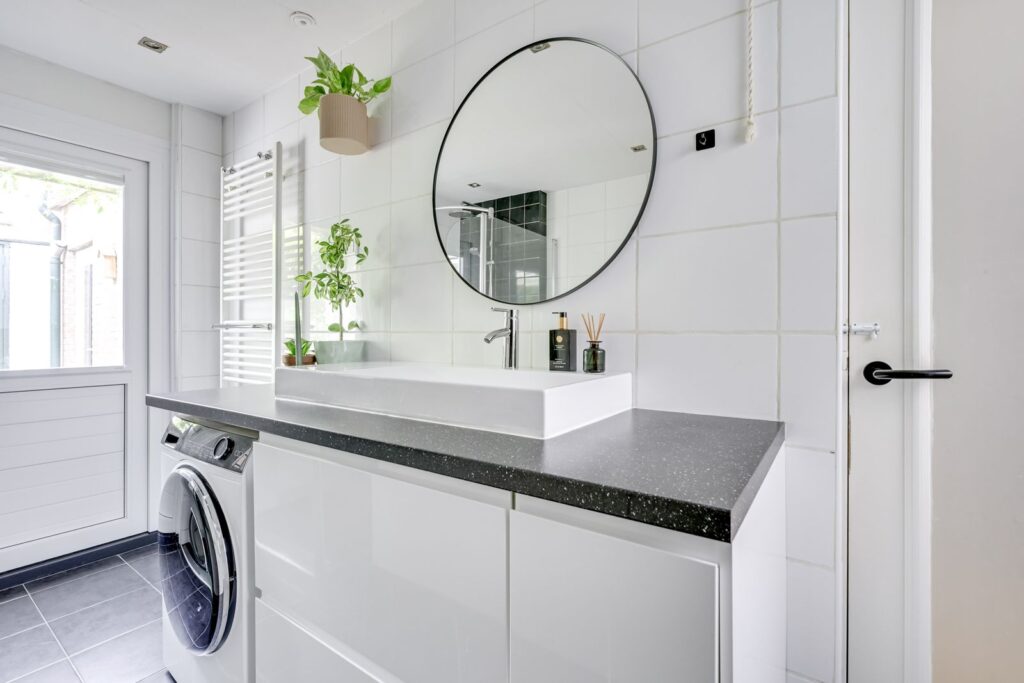 The bathroom is stylishly finished and includes a bathtub, separate shower, toilet, sink, and vanity unit. This is also where the washing machine connection is located. Behind the bathroom, there is a second patio and a separate storage room, ideal for bicycles or extra storage.