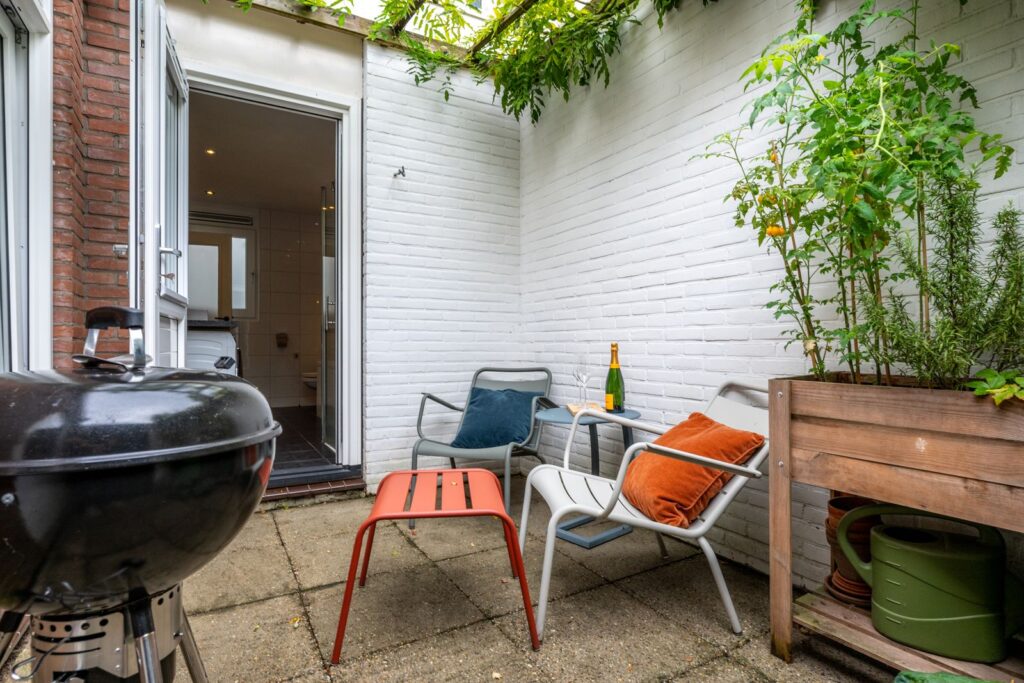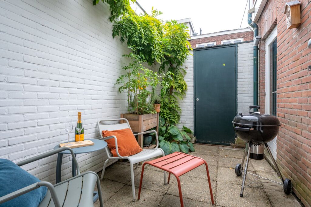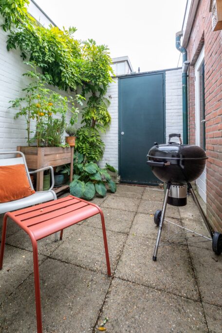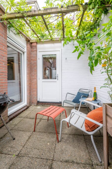 De woning beschikt over twee patio's: een knusse patio bij de woonkamer met veel privacy en een tweede patio bij de slaapkamer en badkamer, beide onderhoudsvriendelijk aangelegd en met genoeg ruimte voor een zitje of groene oase. Ook is er een ingang achterom aanwezig.