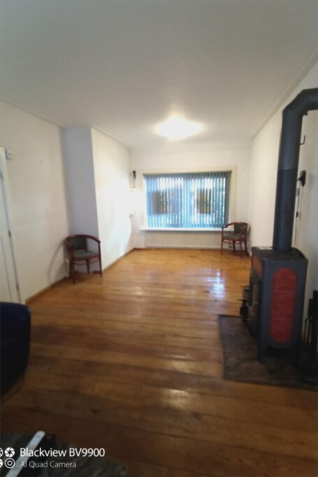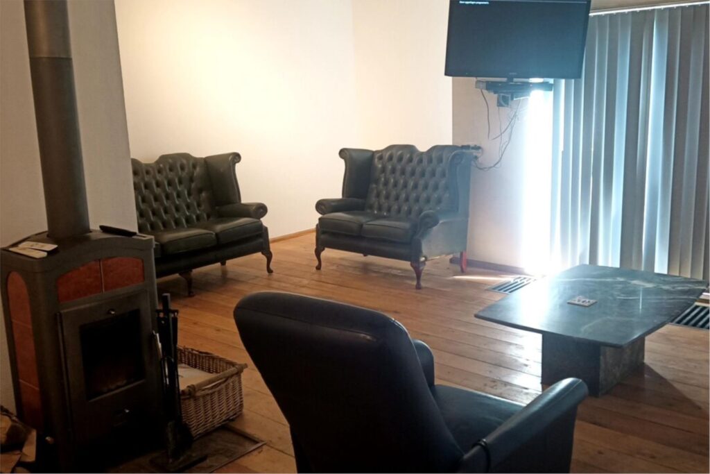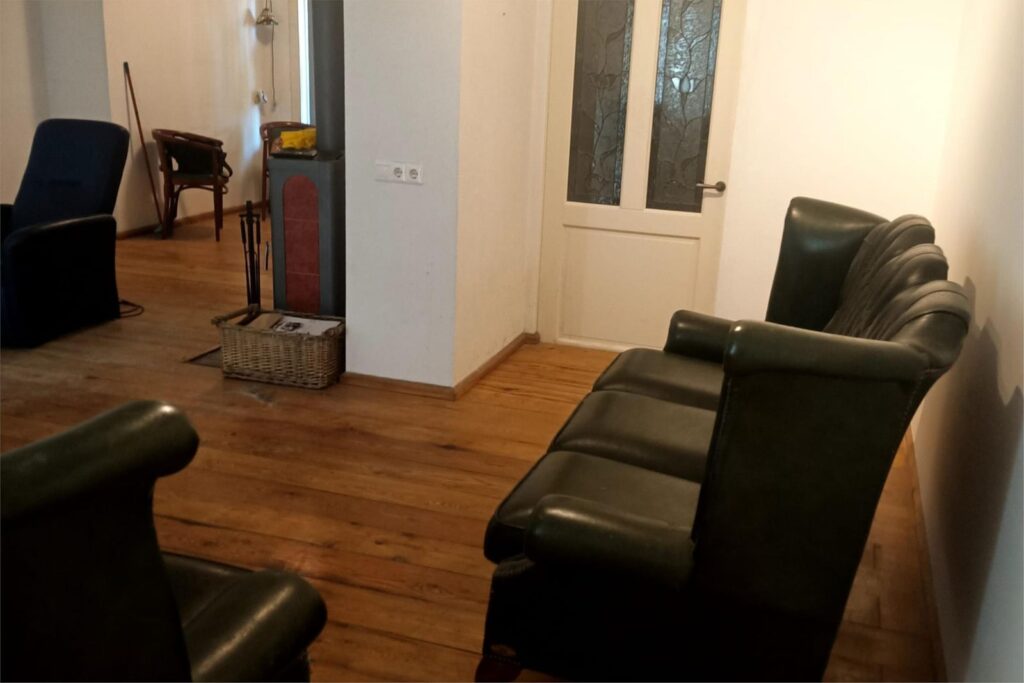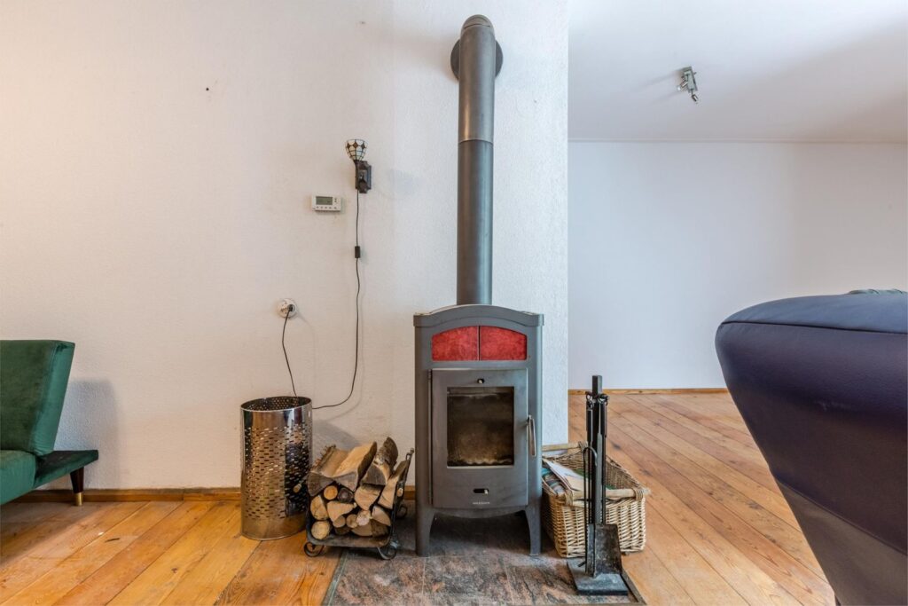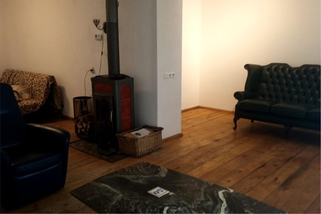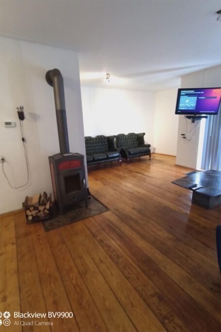 2. Benedenverdieping, 67 m2, hal en woonkamer met houtkachel, duurzaam lariks houten
