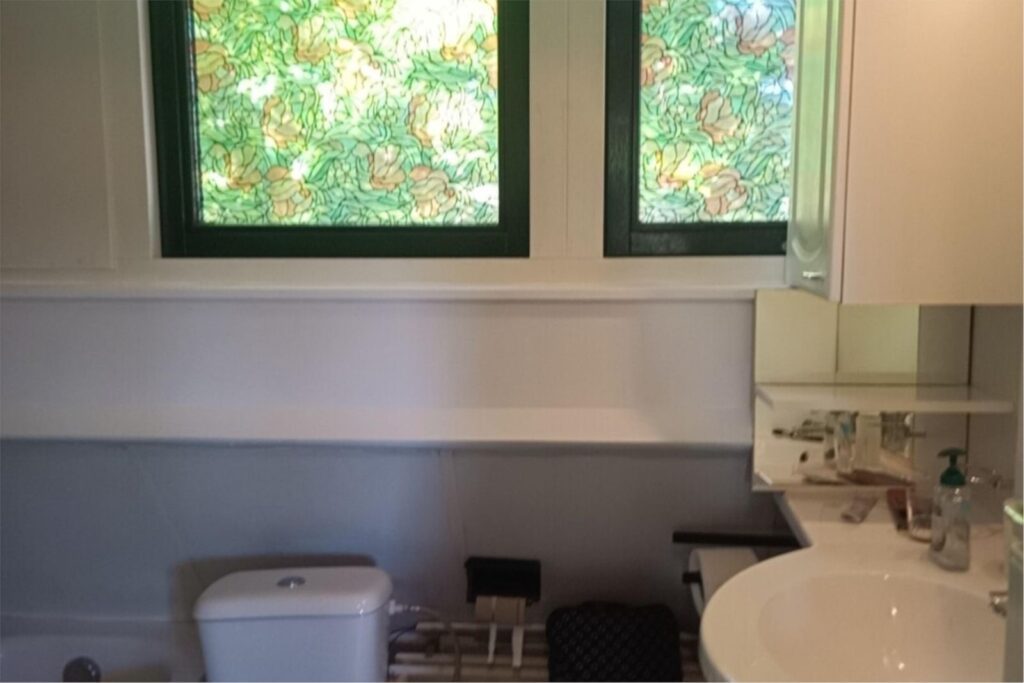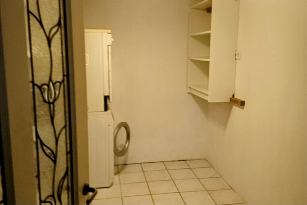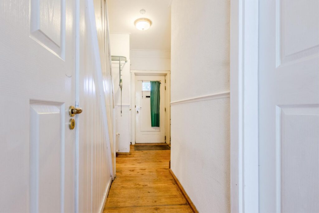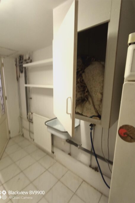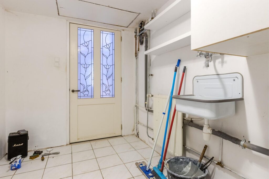 Naast de woonkamer bevindt zich de bijkeuken, toegankelijk via een glas-in-looddeur. Hier vindt u een spoelbak met warm en koud water. Er is ruimte voor een wasmachine en een droger alsmede veel bergruimte. Tevens is er een slimme doorvoer die de was vanaf de eerste etage rechtstreeks in een kast naast de wasmachine doet belanden.