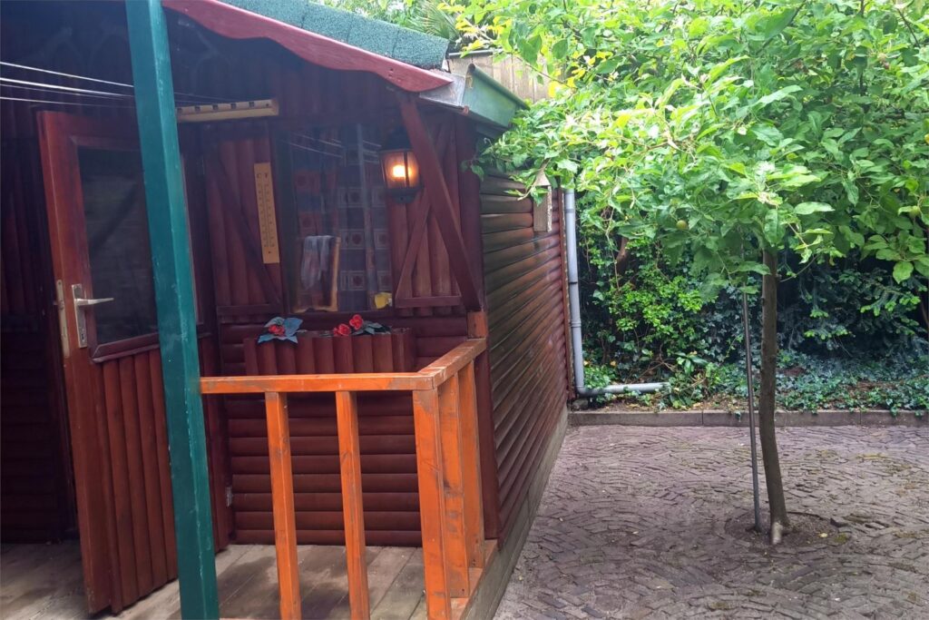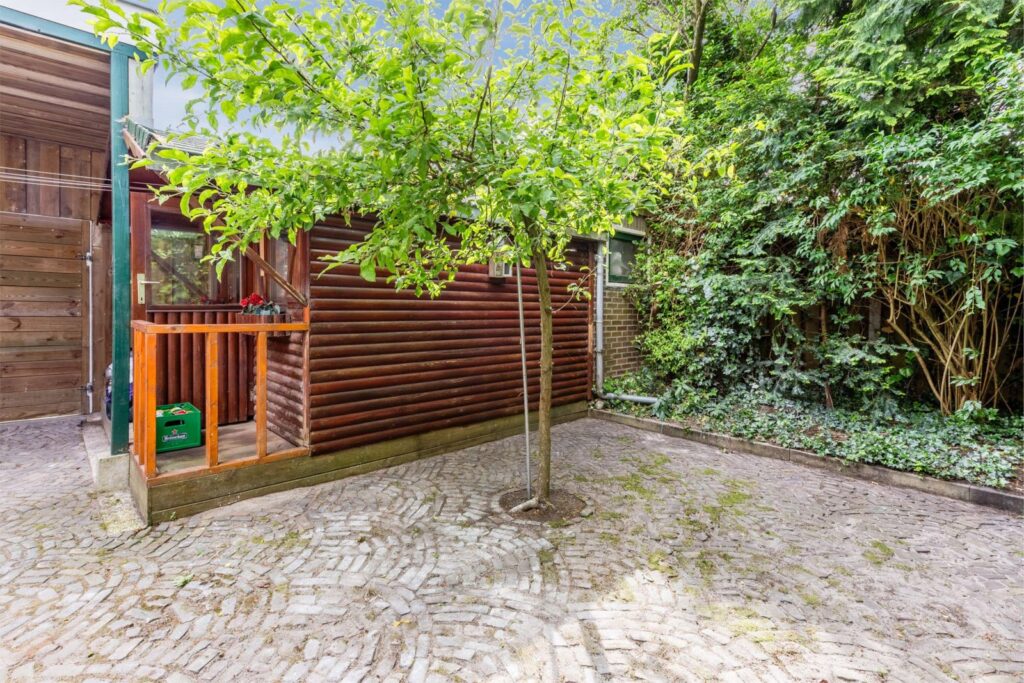 Via een glazen schuifdeur stapt u de ruime achtertuin in, waar u onder meer een deels overdekt terras van authentieke eeuwenoude klinkertjes vindt en een geïsoleerde houten Alpenhut, perfect als logeer- of fitnessruimte. Door de vele bomen en de kapconstructie biedt de achtertuin veel privacy, inkijk is niet mogelijk, terwijl de ligging toch heel zonnig is. De diepte van de tuin is 9,55 meter en de maximale breedte is 8,20 meter. Achter de Alpenhut is er ook een gemetselde schuur die via de gang naast de achtertuin bereikbaar is. De schuur is voorzien van een betonnen dak met daarop een daktuin. Door de 1,8 meter brede brandgang is de schuur ook toegankelijk voor een motor.