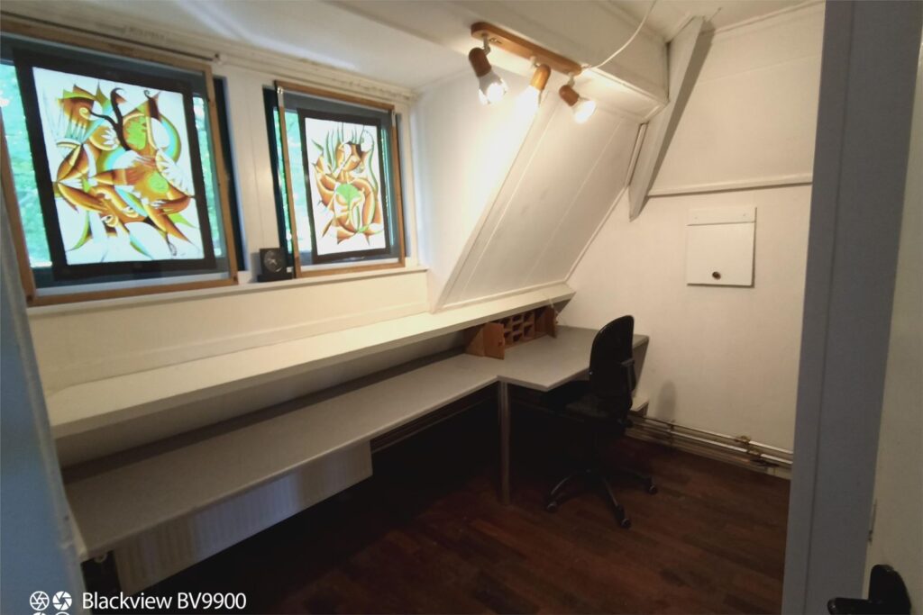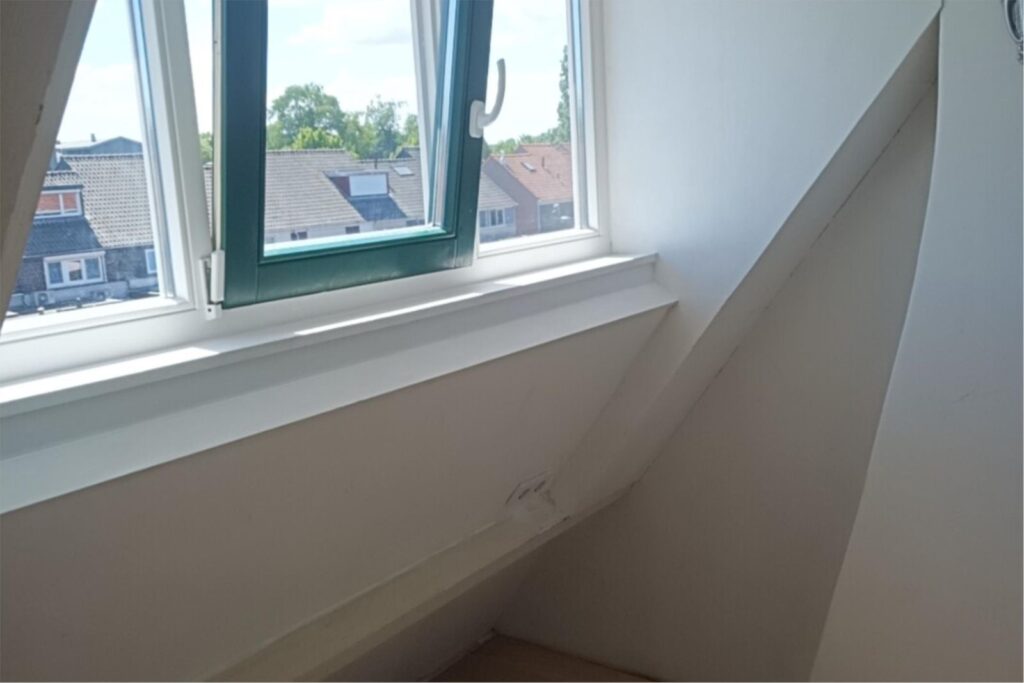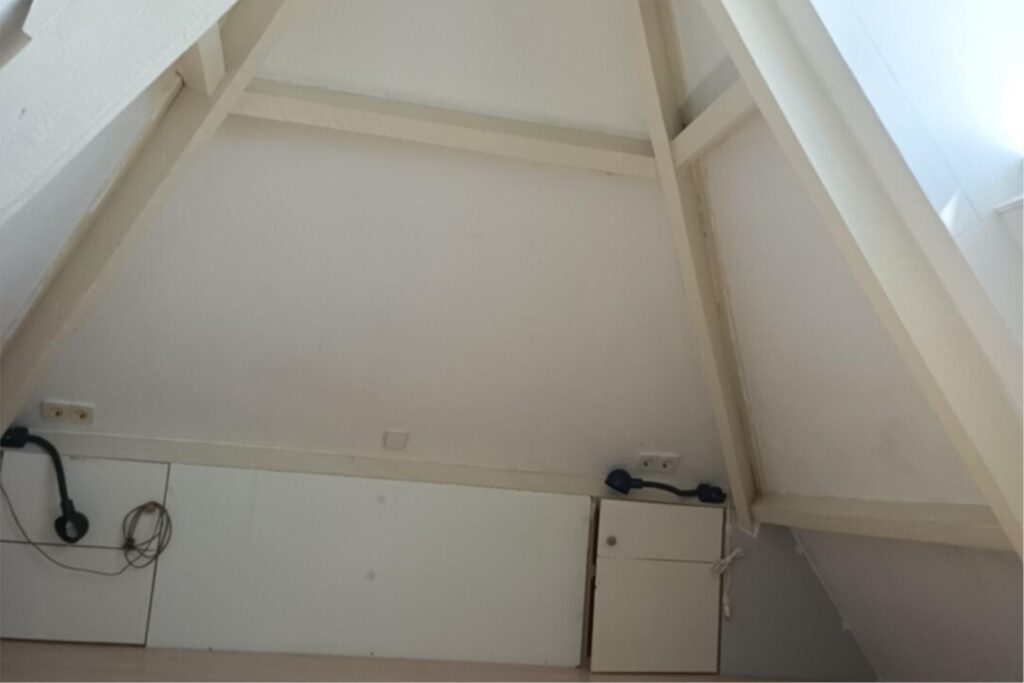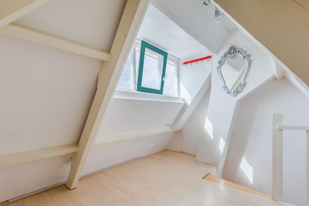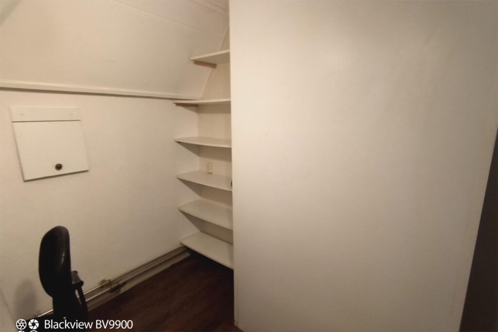 Via een schuifdeur bereikt u de trap naar de zolderverdieping, voorzien van een dakkapel met ruim uitzicht. Hier stond tot voor kort een kingsize bed met diverse kastjes en een klein bureau. Deze kamer biedt volop bergruimte en is perfect als extra slaapkamer of hobbyruimte. Deze zolderkamer is niet meegerekend bij het woonoppervlak.