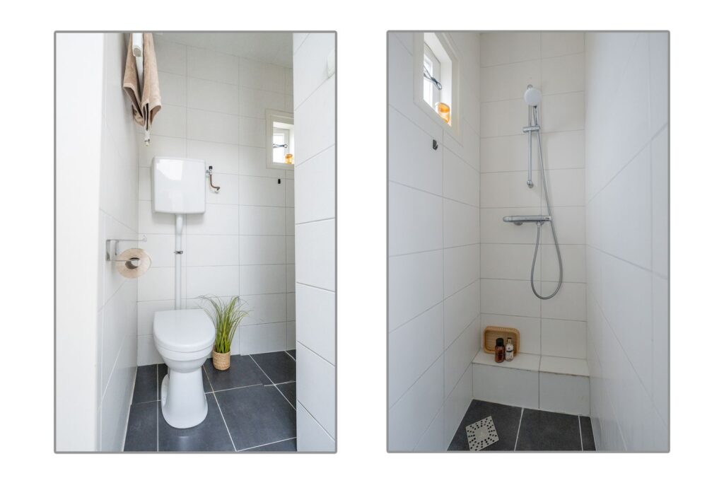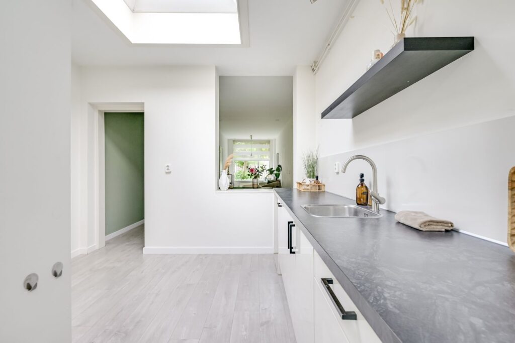 Via de voordeur kom je aan in een nette hal met meterkast en toegang tot de trap naar boven. Vervolgens loop je door naar de woonkamer een heerlijke lichte ruimte met grote raampartijen aan beide zijden en genoeg plek voor een comfortabele zithoek aan de voorzijde en een eethoek in het midden. De woonkamer loopt door in een eetkamer en staat in halfopen verbinding met de keuken. De keuken is uitgevoerd in wit met een donker werkblad, uitgerust met een inductiekookplaat, afzuigkap, vaatwasser en voldoende opbergruimte. Vanuit de keuken heb je toegang tot de badkamer met douche en toilet. Ook is er een deur naar de achtertuin.