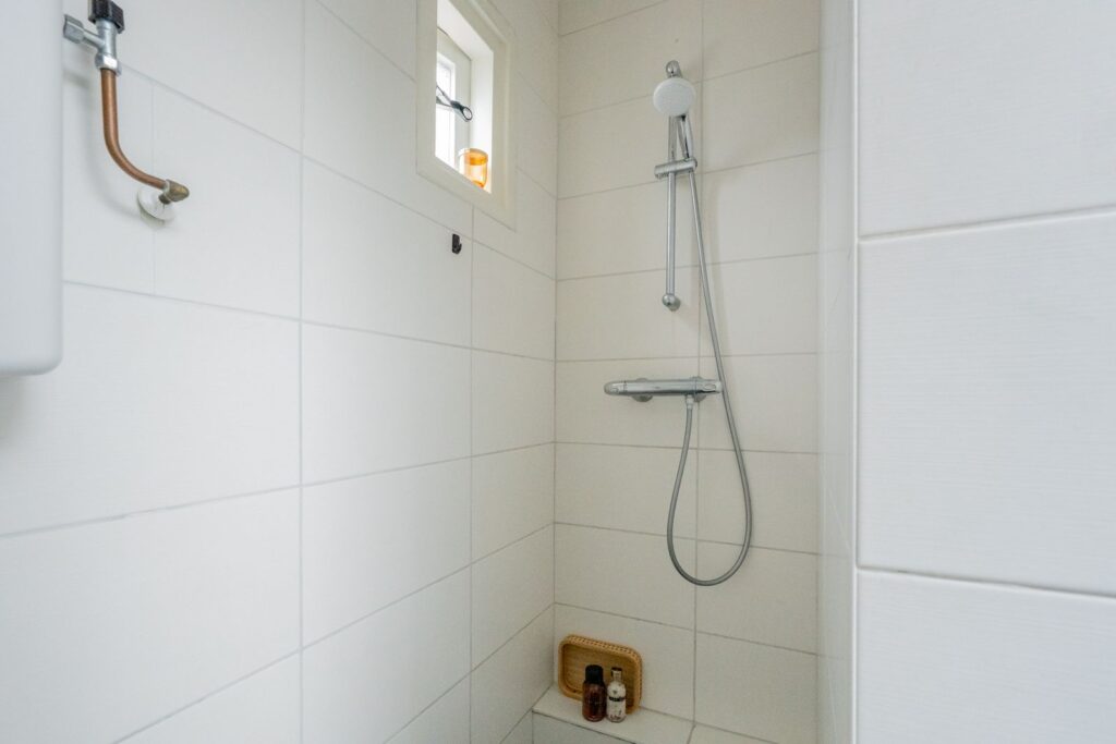 Through the front door, you enter a neat hallway with the meter cupboard and access to the stairs to the upper floor. You then walk into the living room – a wonderfully bright space with large windows on both sides and enough room for a comfortable sitting area at the front and a dining area in the middle. The living room continues into a dining area and has a semi-open connection to the kitchen. The kitchen is finished in white with a dark countertop and equipped with an induction cooktop, extractor hood, dishwasher, and ample storage space. From the kitchen, you have access to the bathroom with shower and toilet. There is also a door leading to the backyard.