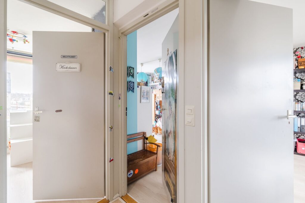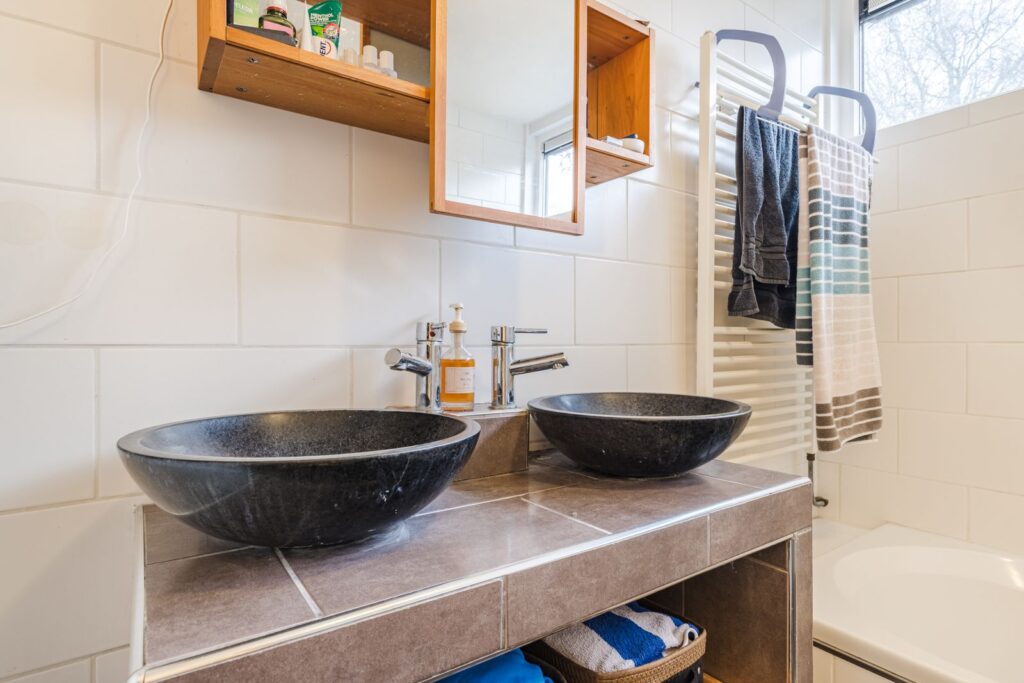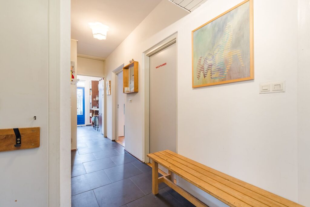 Op de eerste verdieping zijn drie slaapkamers, waarvan momenteel een nu in gebruik als kantoorruimte. De slaapkamers zijn ca 9 m² en 13m². De slaapkamers zijn ruim en licht. De badkamer ligt aan de voorzijde van de woning en is voorzien van een ligbad, inloopdouche, tweede toilet en wastafelmeubel met twee wastafels. In de badkamer is natuurlijk daglicht met ventilatie naar buiten.