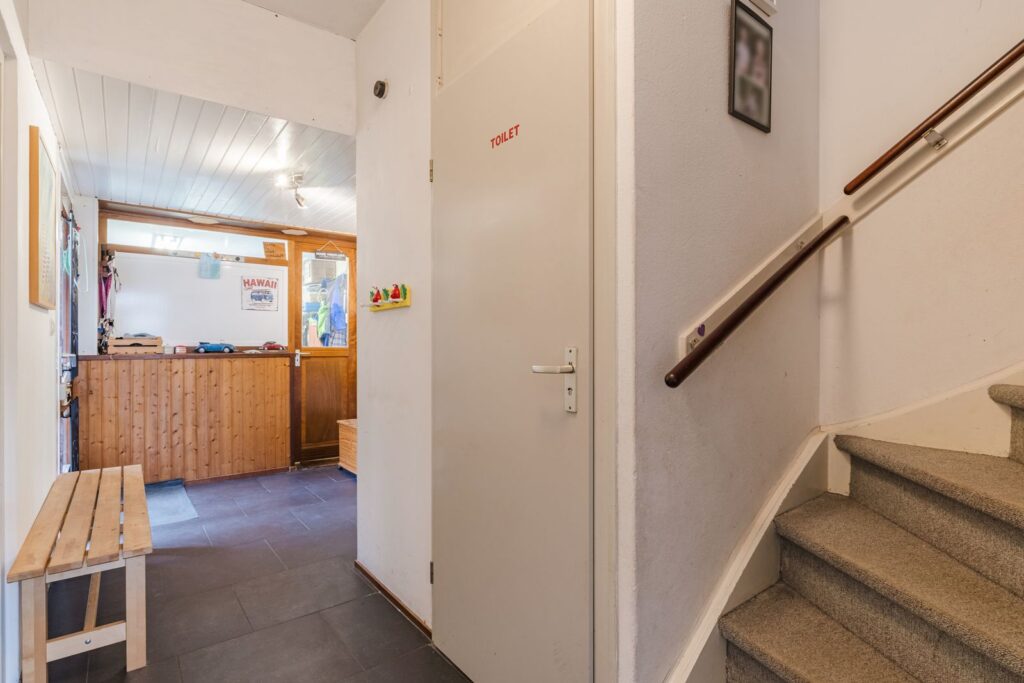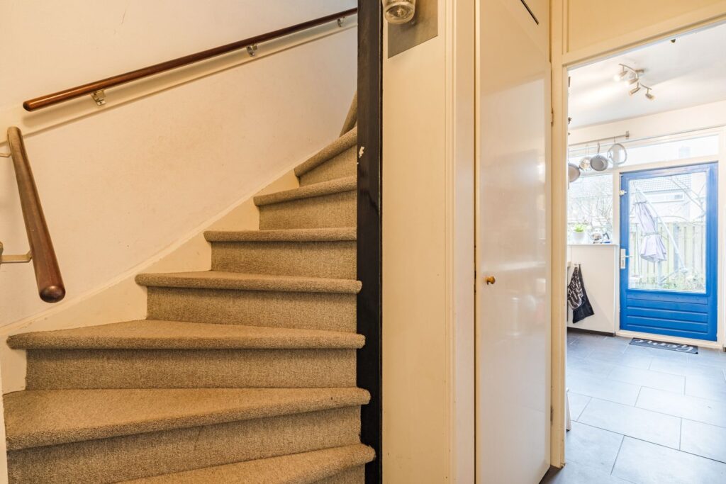 Entree, ruime hal met toilet, meterkast en toegang naar de garage, de woonkamer en de keuken. Onder de trap is een ruime trapkast aanwezig voor extra bergruimte. De woonkamer heeft veel natuurlijk lichtinval vanwege de grote schuifpui op het zuiden. Aan de noordkant is de eetkamer met open aansluiting tot de woonkamer. De keuken is gesloten ten opzichte van de woonkamer, maar met een opening in de muur is er verbinding met de woonkamer. Dus is er tijdens het koken toch gezellig contact met de mensen in de woonkamer. Via de keuken of via de schuifpui in de woonkamer bereik je de heerlijke tuin, gelegen op het zuiden. De tuin is 5 jaar geleden opnieuw aangelegd, waarbij ook een nieuwe schutting met betonpalen is geplaatst. Langszij van de woning is ruimte om te parkeren en mogelijkheid tot het plaatsen van een laadpaal. Ook is hier een fietsenschuur aanwezig als extra bergruimte.