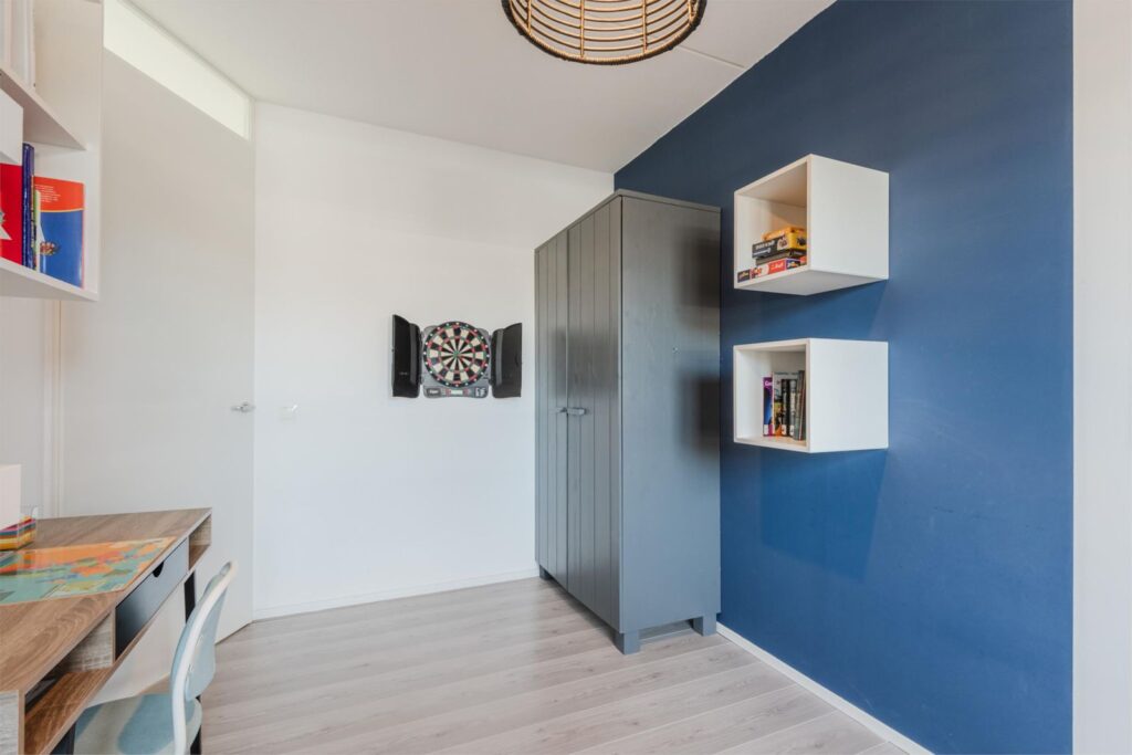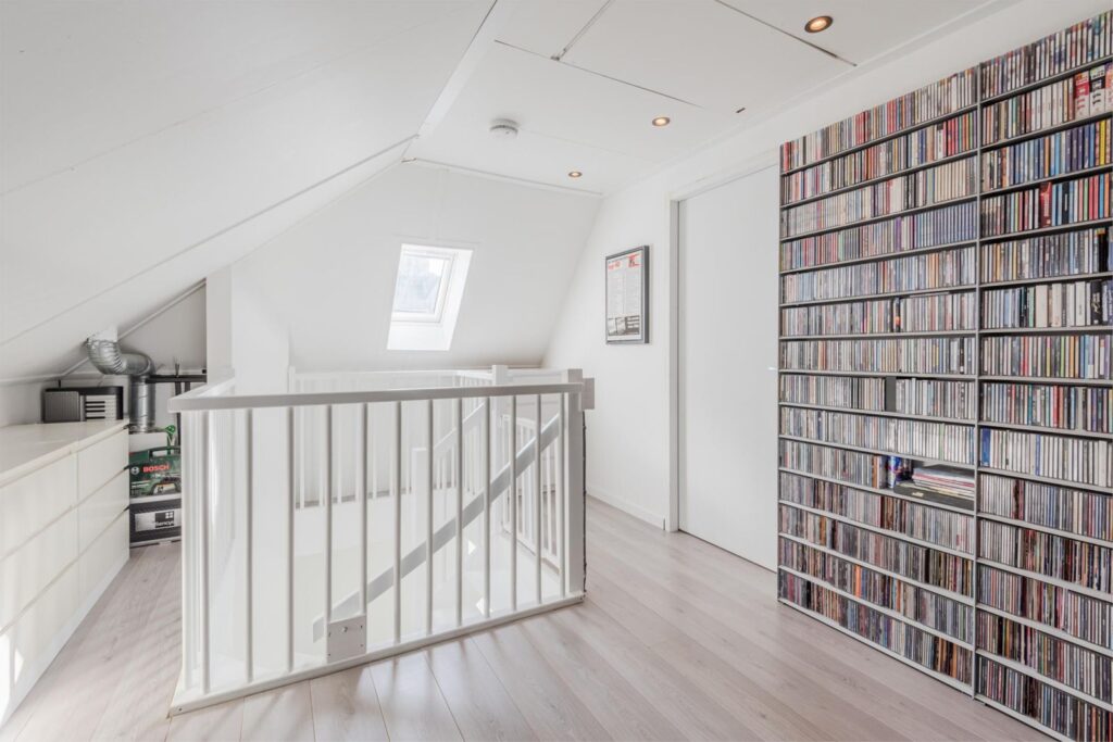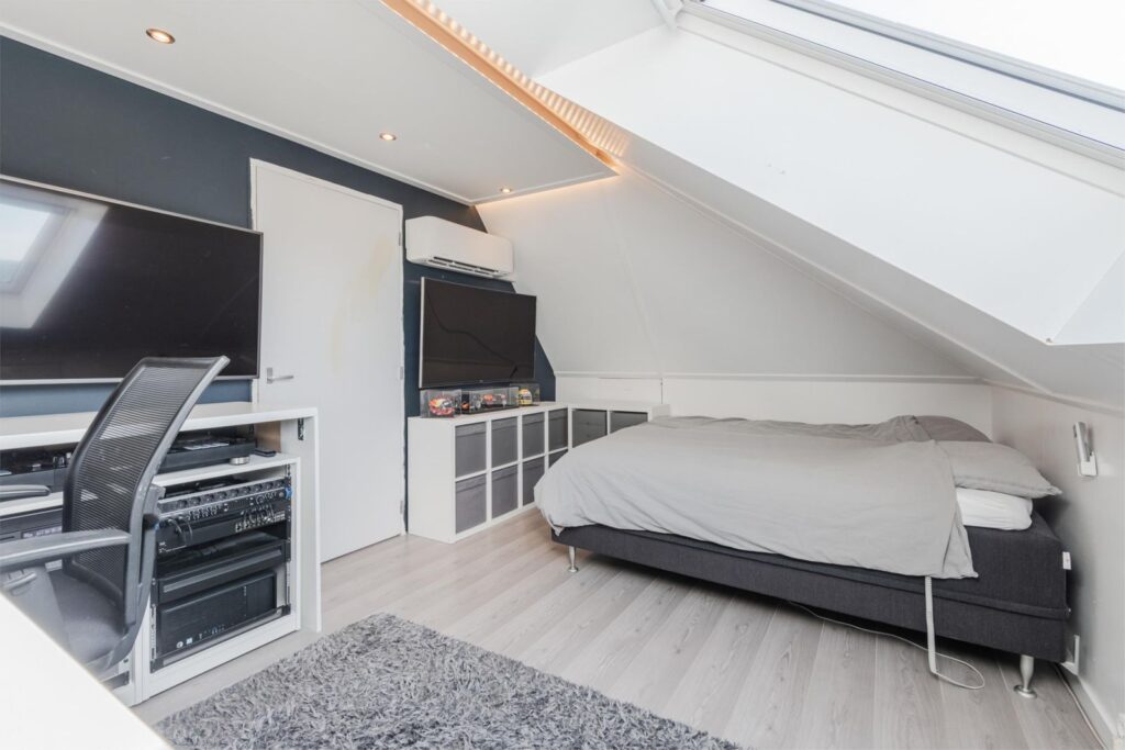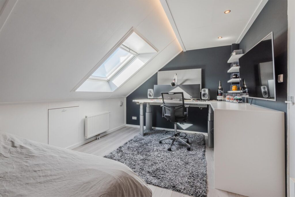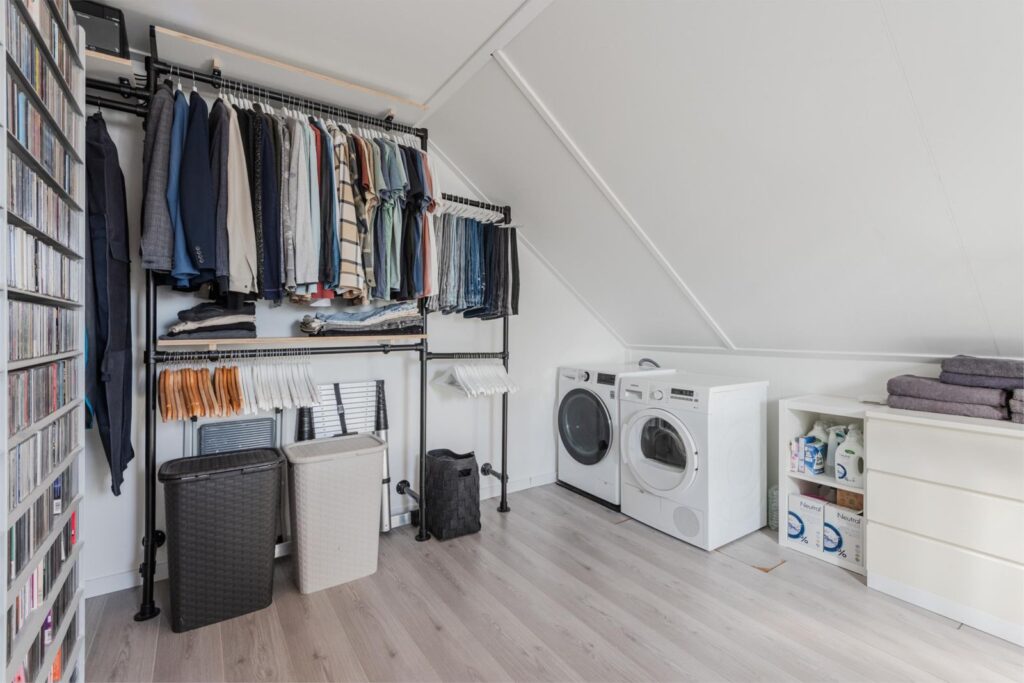Via een vaste trap kom je op de zolder. Hier heb je nog een grote slaapkamer/ studio waar een Velux dakraam zit. De andere helft van de zolder is in gebruik als was- en opbergruimte. Achter de knieschotten en op de vliering is ook nog eens veel ruimte om je spullen op te bergen.