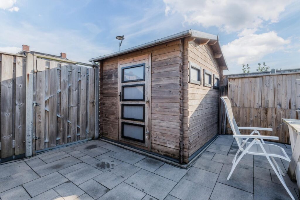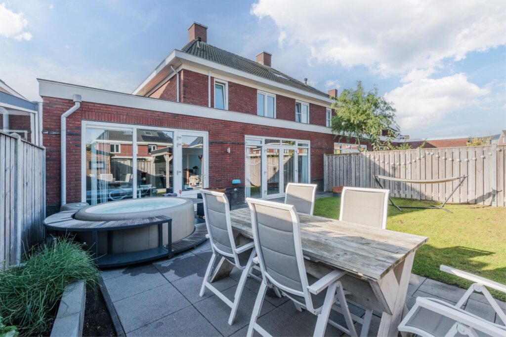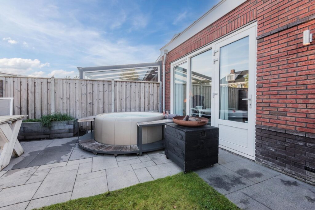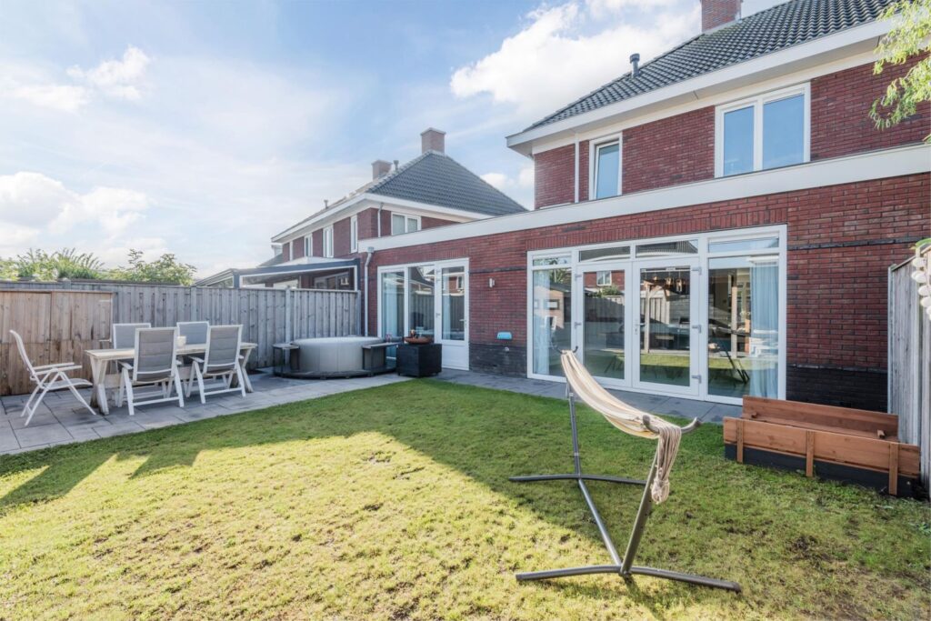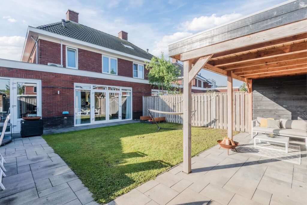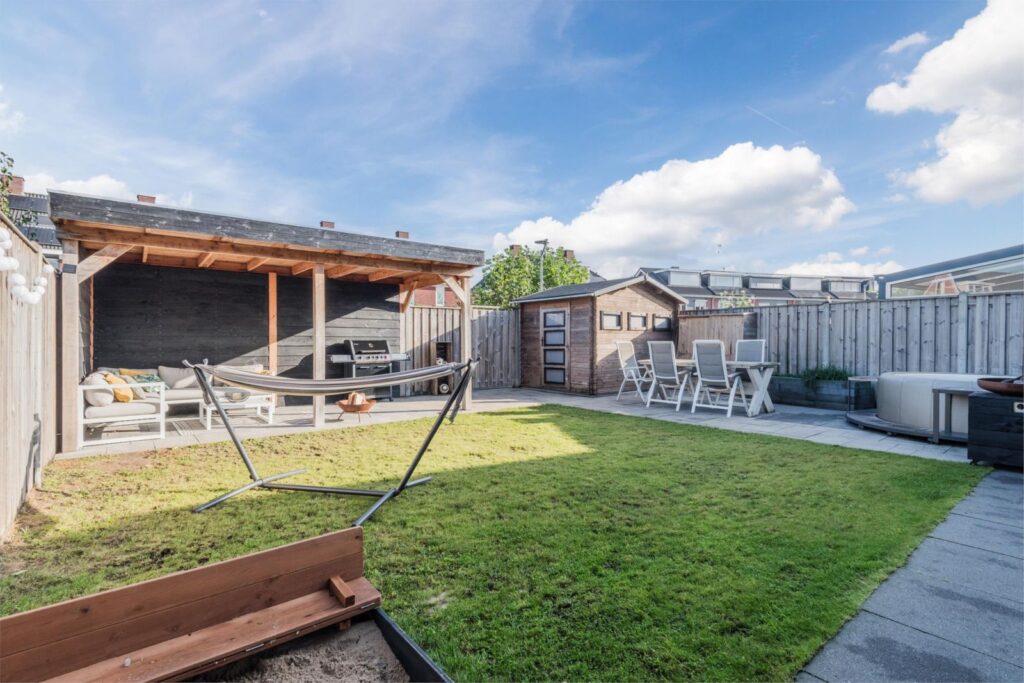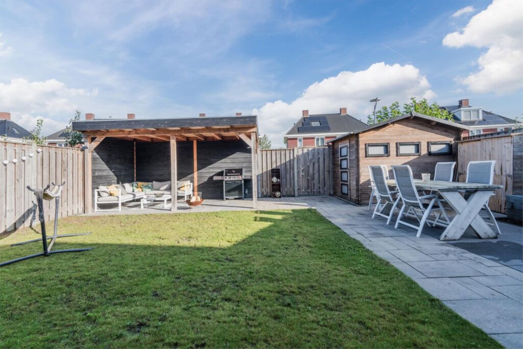 Vanuit de keuken bieden twee openslaande deuren toegang tot de (voor Almere Poort's begrippen) ruime tuin. Deze ligt op het noorden. Door de afmetingen heb je in de lente, zomer en herfst echter altijd zon in je tuin. De tuin is onderhoudsvriendelijk aangelegd met een combinatie van tegels en gras. Links achter in de tuin is een veranda waar je heerlijk zit wanneer het te warm is (of in de regen). Rechts achter in de tuin is een berging waar je je fietsen en gereedschap kwijt kunt. Doordat de tuin erg breed en diep is, is er voldoende ruimte om te spelen, buiten te eten en een feestje te vieren. De huidige bewoners hebben er ook een grote jacuzzi in staan. Via de poort achterin de tuin rijd je gemakkelijk weg op je fiets of kun je nog een auto kwijt op de openbare parkeerplek.