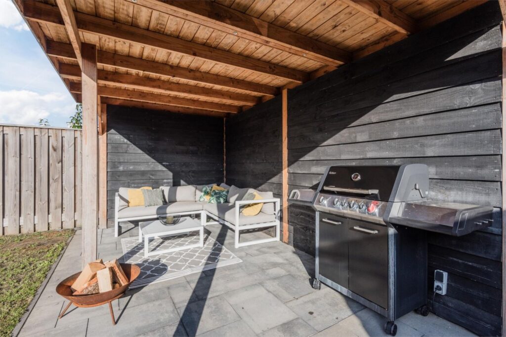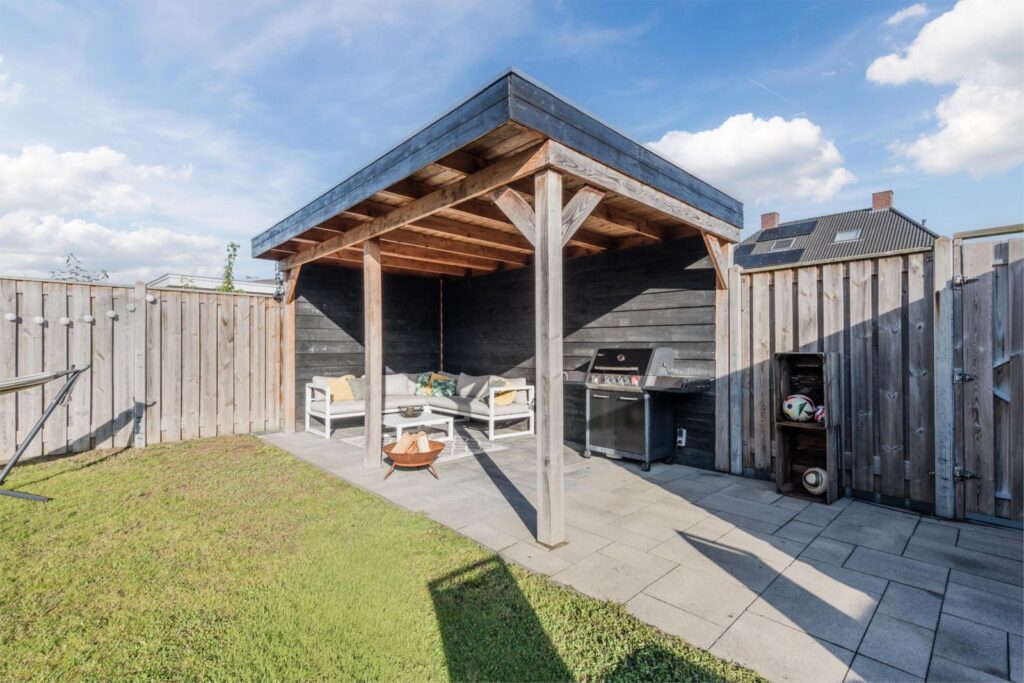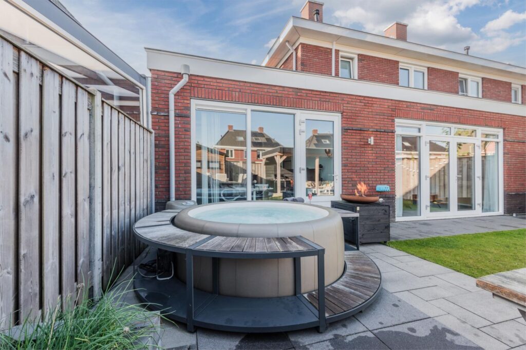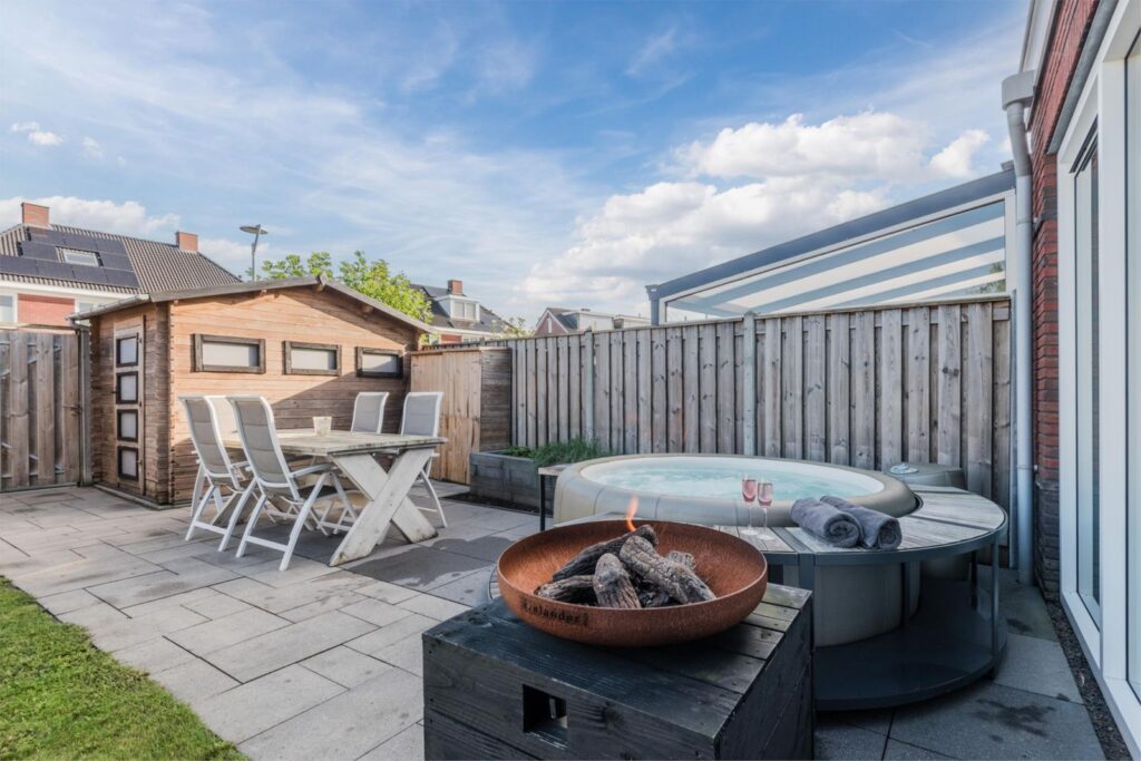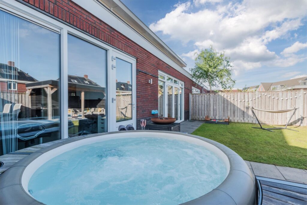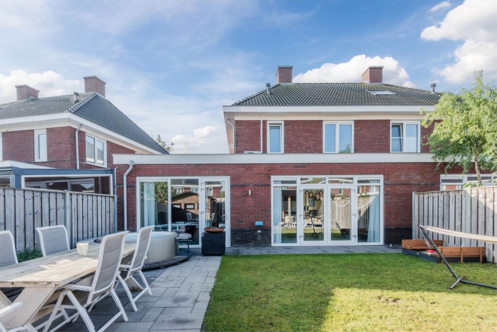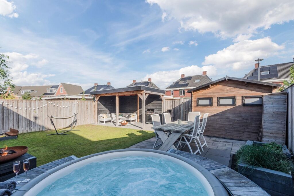 Vanuit de keuken bieden twee openslaande deuren toegang tot de (voor Almere Poort's begrippen) ruime tuin. Deze ligt op het noorden. Door de afmetingen heb je in de lente, zomer en herfst echter altijd zon in je tuin. De tuin is onderhoudsvriendelijk aangelegd met een combinatie van tegels en gras. Links achter in de tuin is een veranda waar je heerlijk zit wanneer het te warm is (of in de regen). Rechts achter in de tuin is een berging waar je je fietsen en gereedschap kwijt kunt. Doordat de tuin erg breed en diep is, is er voldoende ruimte om te spelen, buiten te eten en een feestje te vieren. De huidige bewoners hebben er ook een grote jacuzzi in staan. Via de poort achterin de tuin rijd je gemakkelijk weg op je fiets of kun je nog een auto kwijt op de openbare parkeerplek.