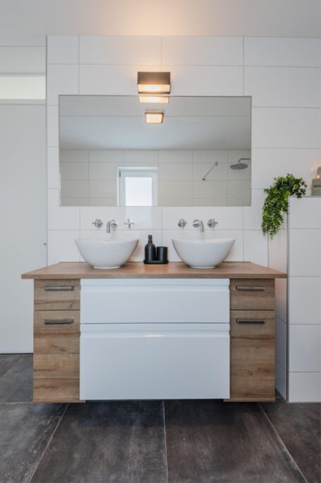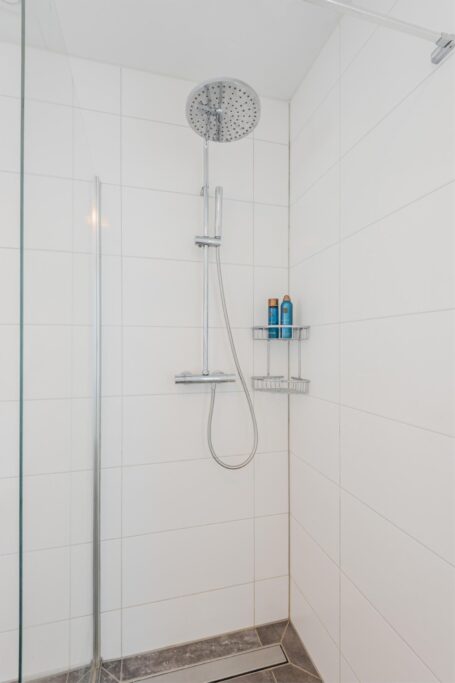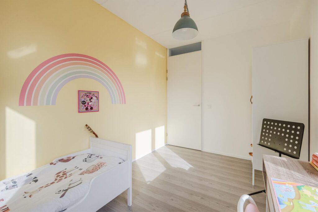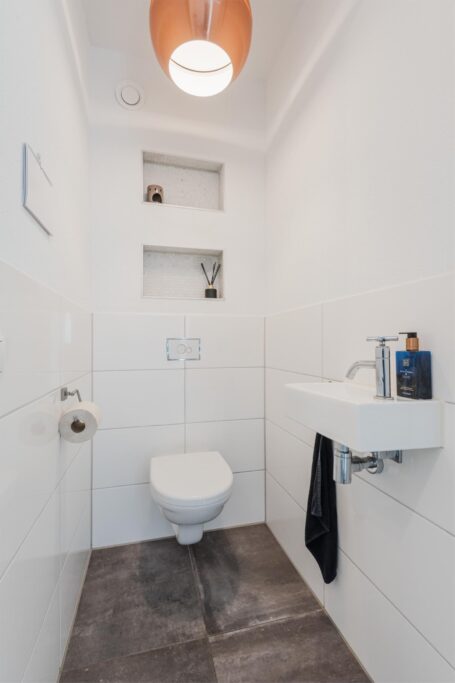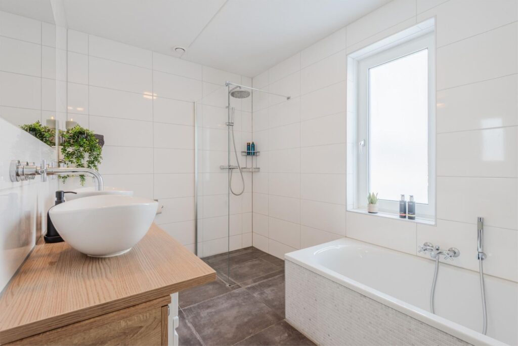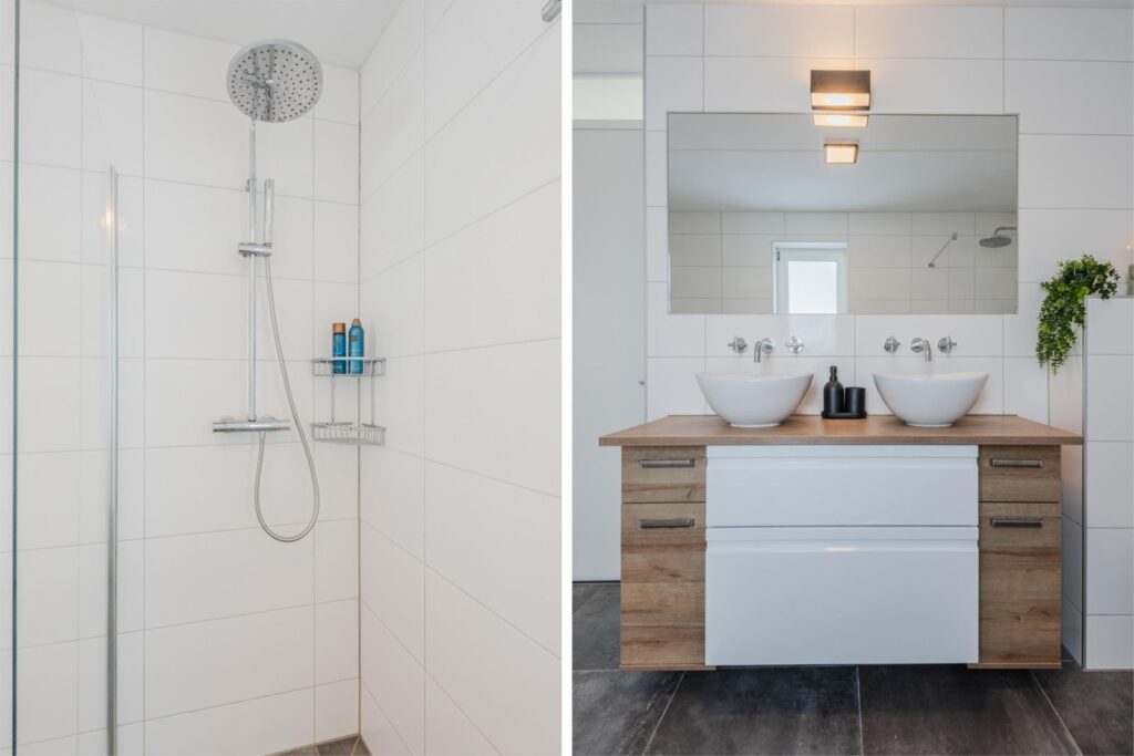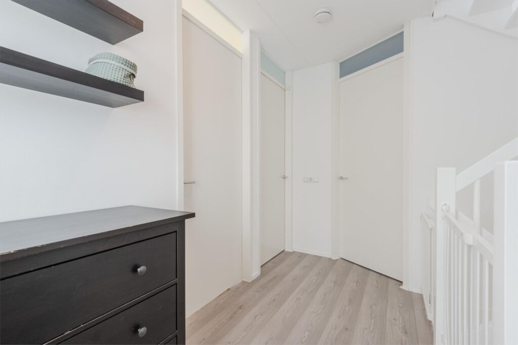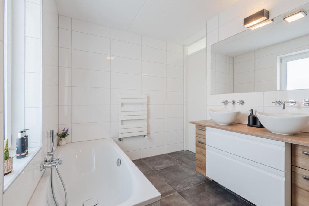 Op de eerste verdieping zie je allereerst een grote hoeveelheid licht op de overloop. Deze verdieping is voorzien van een laminaatvloer. Hier vind je drie slaapkamers en een ruime badkamer. De master bedroom biedt voldoende ruimte voor een groot bed en een inbouw garderobekast. Daarnaast heb je een Frans balkon. De twee andere slaapkamers zijn ook van een mooi formaat en erg licht. In de badkamer is zowel een ruime inloopdouche als een comfortabel bad. Daarnaast zijn er 2 waskommen en een vrijhangend toilet. Het raam laat veel daglicht binnenvallen én zorgt voor goede ventilatie.
