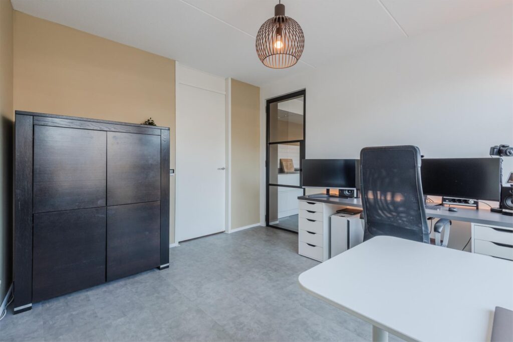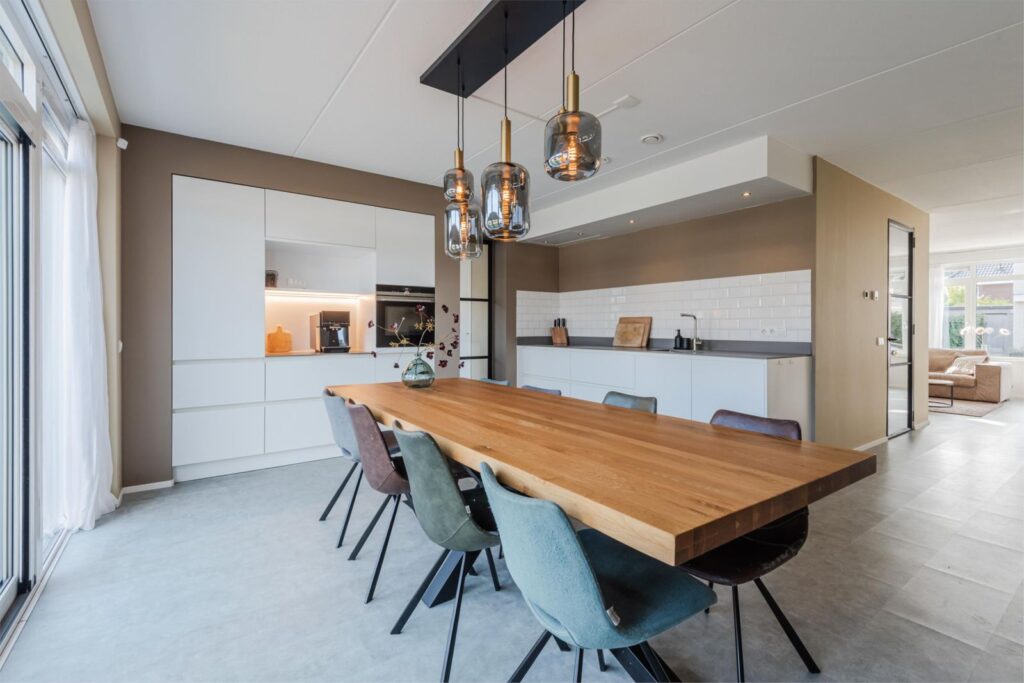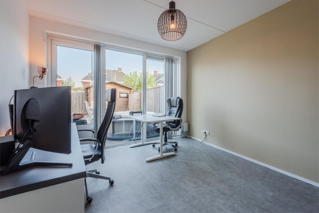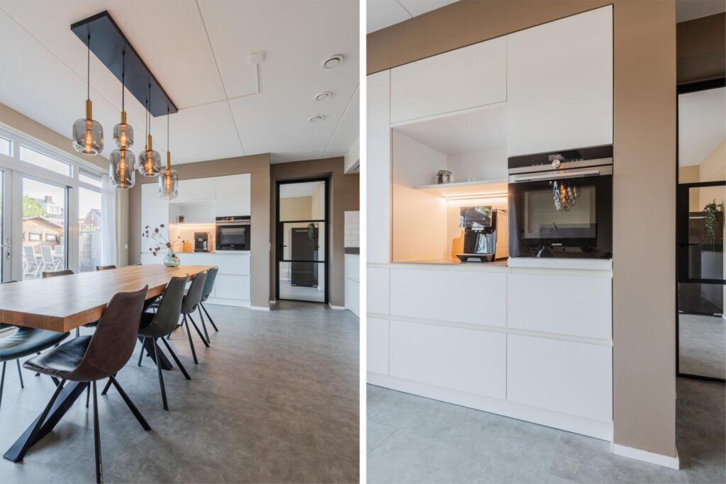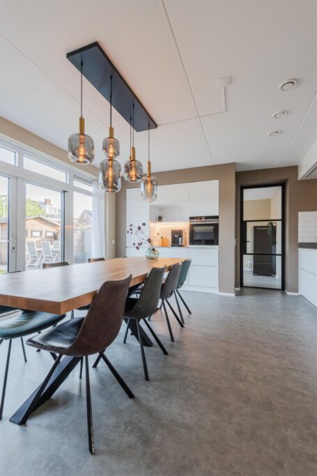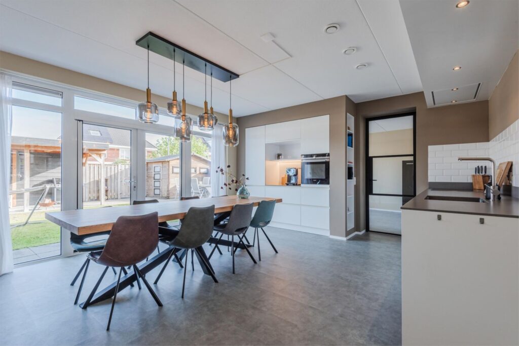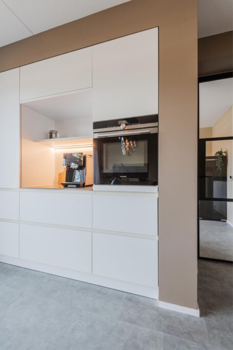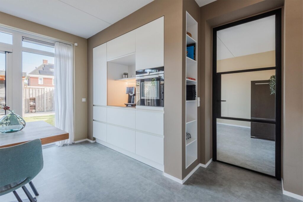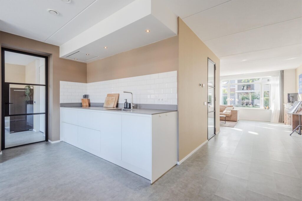 Bij binnenkomst in de woonkamer valt direct op hoe licht deze is door de vele ramen. De muren zijn afgewerkt in natuurlijke tinten en in de woonkamer is plek voor een ruime zithoek. De woonkeuken ligt aan de achterzijde van de woning. Deze is modern afgewerkt met een combinatie van wit matte kastfrontjes en een composiet grijs aanrechtblad. Daarnaast is er erg veel opbergruimte in zowel de kastenwand als de rest van de keuken. Er is een inductie kookplaat, een koelkast, een vaatwasser, een combi oven/ magnetron en... plek voor een grote eettafel waar je lange avonden kunt natafelen. Tijdens het bereiden van een maaltijd praat je gezellig met je gasten en al etend heb je veel licht en zicht op de achtertuin. Vanuit de keuken heb je toegang tot het kantoor en de bijkeuken. Deze is opgedeeld in twee delen: het voorste deel is een ruim kantoor, het achterste deel een bijkeuken vol opbergmogelijkheden.