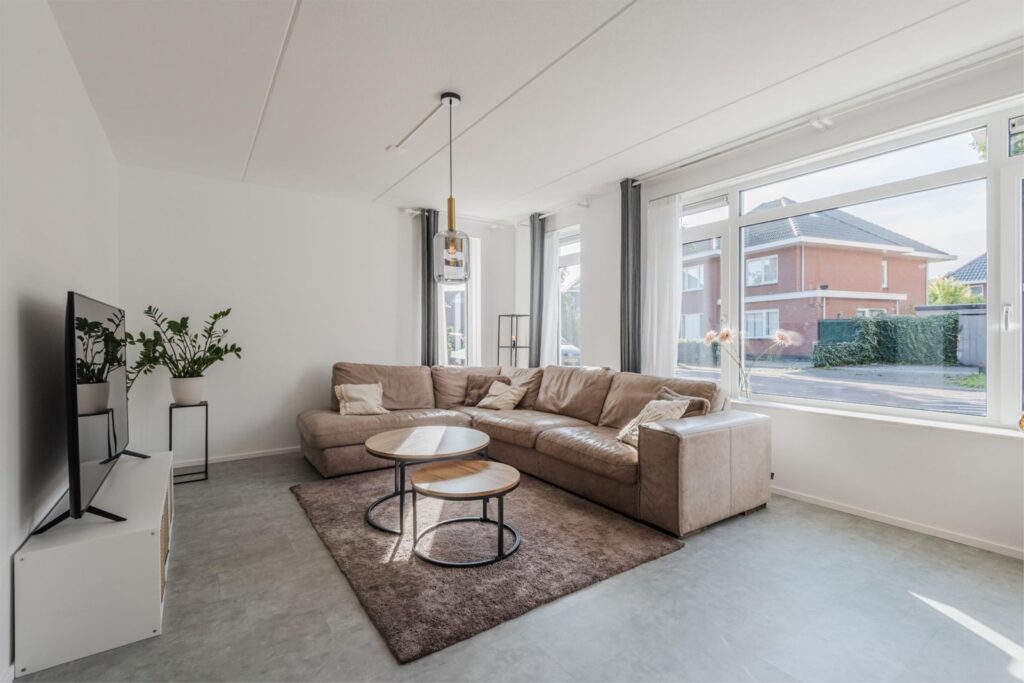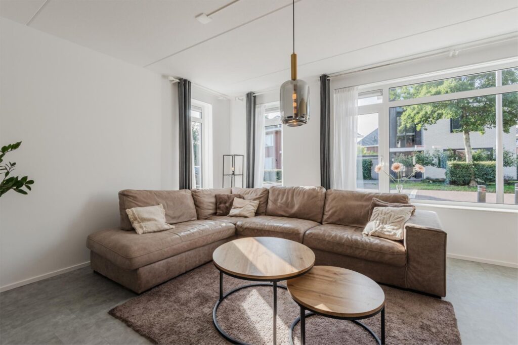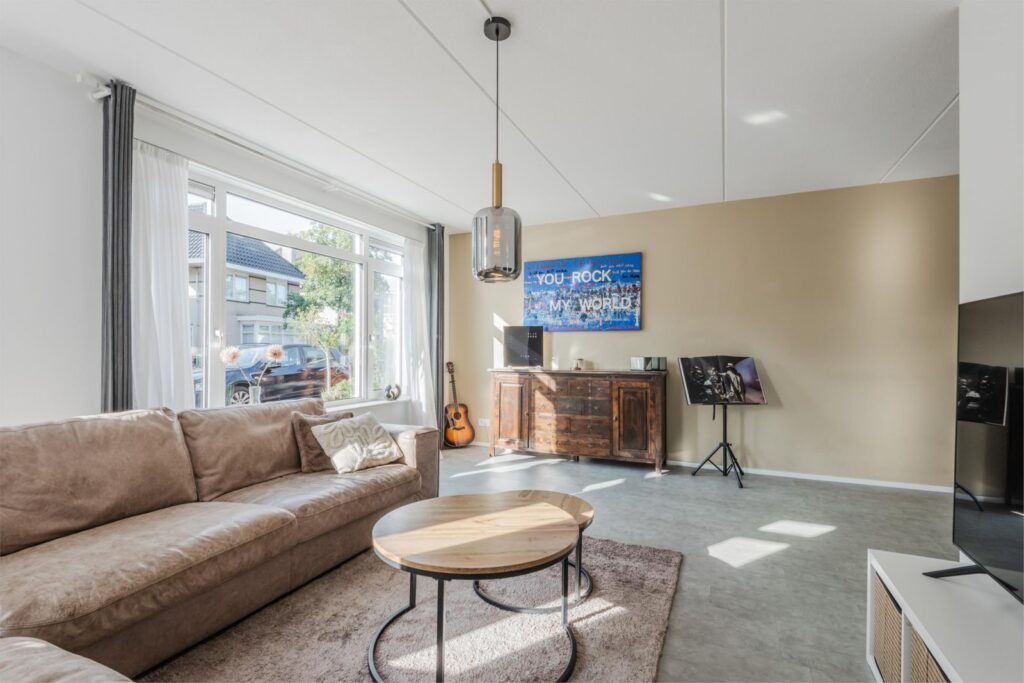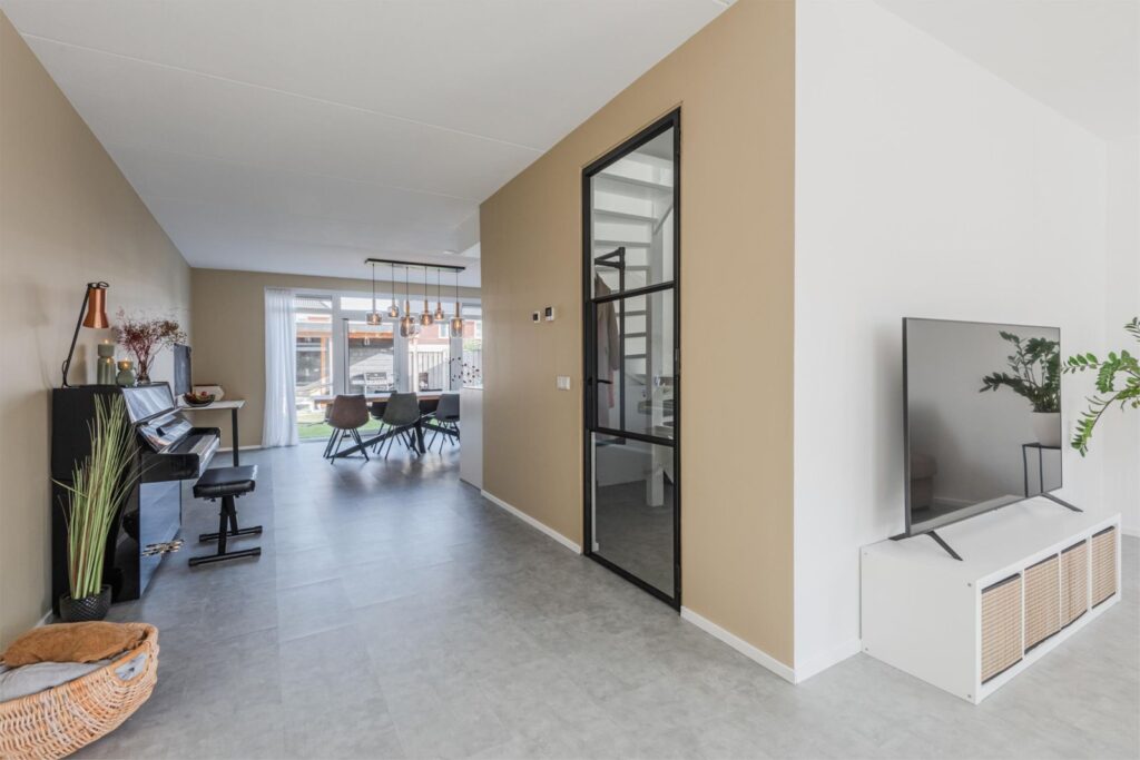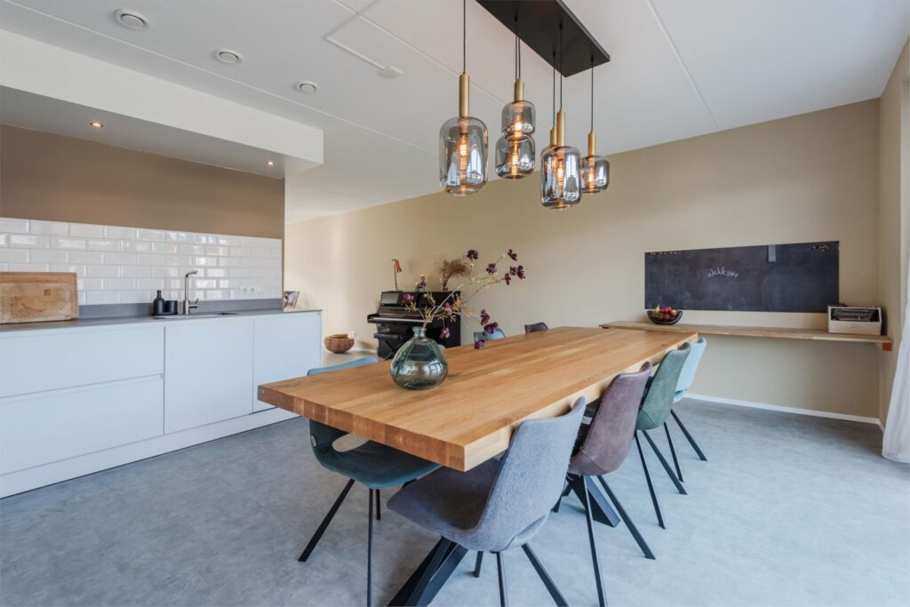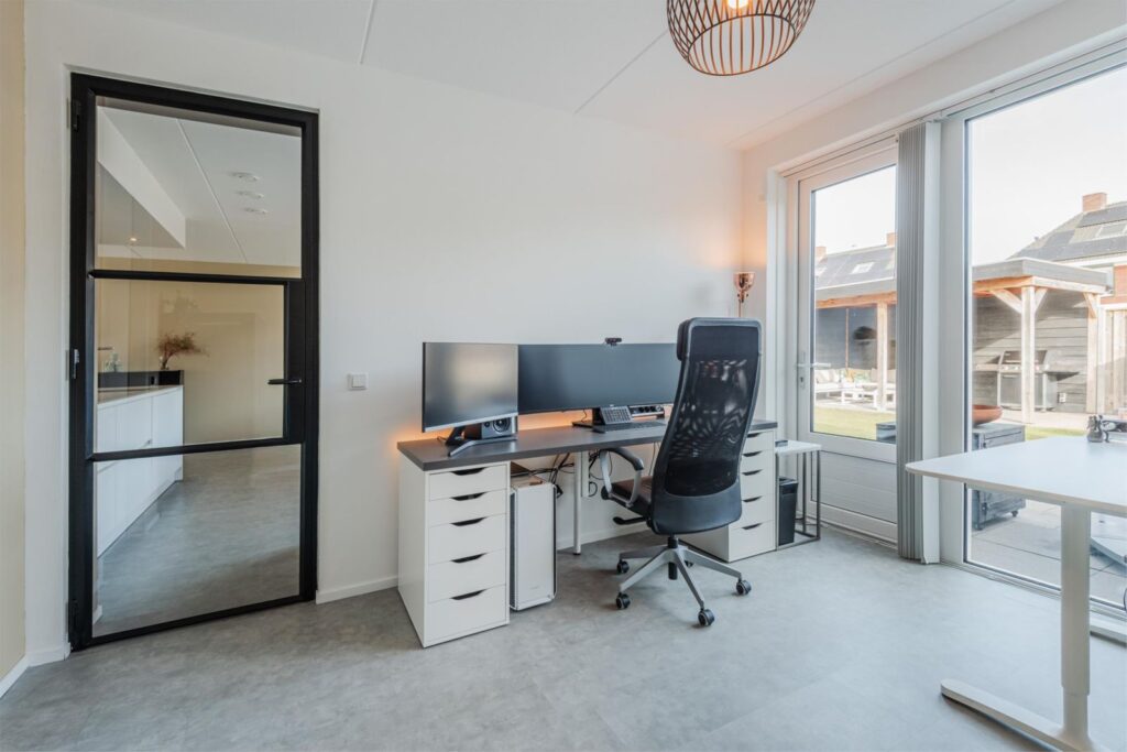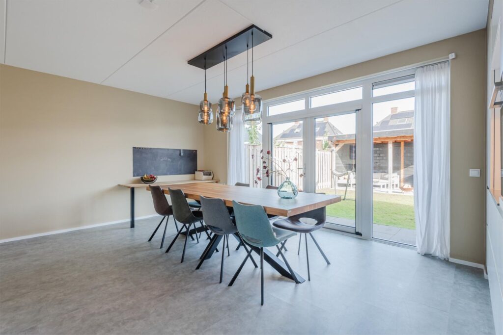 Bij binnenkomst in de woonkamer valt direct op hoe licht deze is door de vele ramen. De muren zijn afgewerkt in natuurlijke tinten en in de woonkamer is plek voor een ruime zithoek. De woonkeuken ligt aan de achterzijde van de woning. Deze is modern afgewerkt met een combinatie van wit matte kastfrontjes en een composiet grijs aanrechtblad. Daarnaast is er erg veel opbergruimte in zowel de kastenwand als de rest van de keuken. Er is een inductie kookplaat, een koelkast, een vaatwasser, een combi oven/ magnetron en... plek voor een grote eettafel waar je lange avonden kunt natafelen. Tijdens het bereiden van een maaltijd praat je gezellig met je gasten en al etend heb je veel licht en zicht op de achtertuin. Vanuit de keuken heb je toegang tot het kantoor en de bijkeuken. Deze is opgedeeld in twee delen: het voorste deel is een ruim kantoor, het achterste deel een bijkeuken vol opbergmogelijkheden.