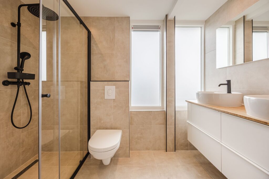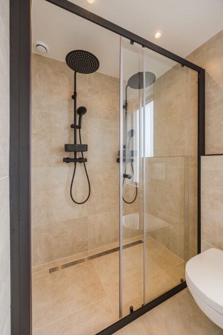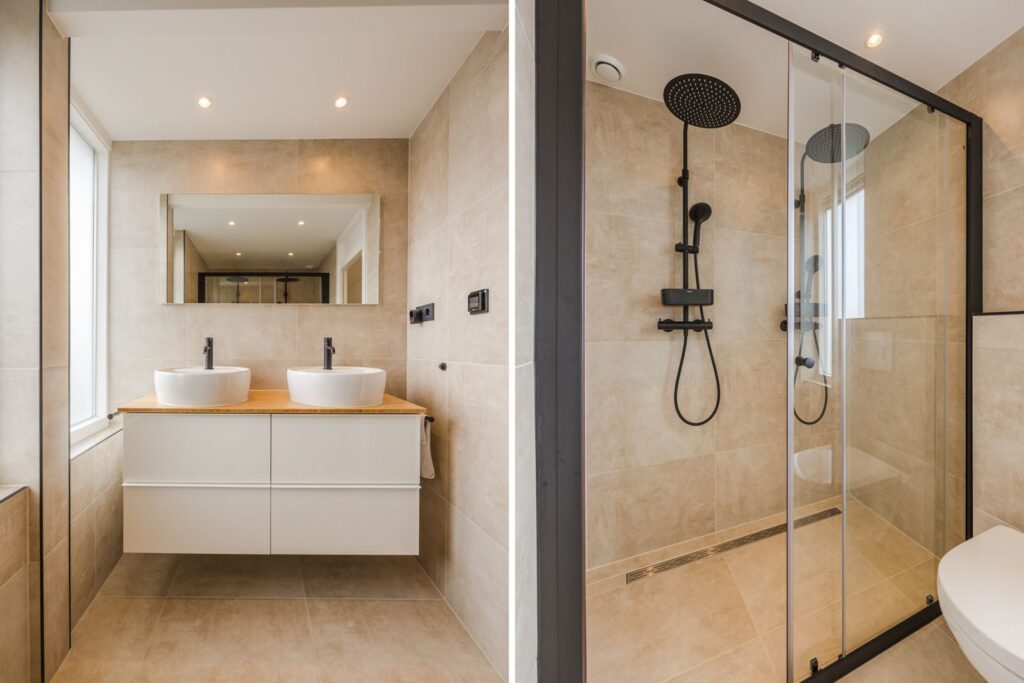 De badkamer ademt comfort en luxe, met een dubbele inloopdouche, een stijlvol badkamermeubel met dubbele wastafel en een tweede toilet. Een heerlijke ruimte om de dag ontspannen te beginnen of af te sluiten.