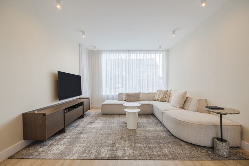 Via de entree bereikt u de hal met moderne toiletruimte en trapopgang naar de verdieping. Vanuit hier stapt u de royale en lichte doorzonwoonkamer binnen, waar direct de hoogwaardige afwerking opvalt. De gehele begane grond is voorzien van een stijlvolle licht eiken vloer, strak gestuukte wanden en comfortabele vloerverwarming.
