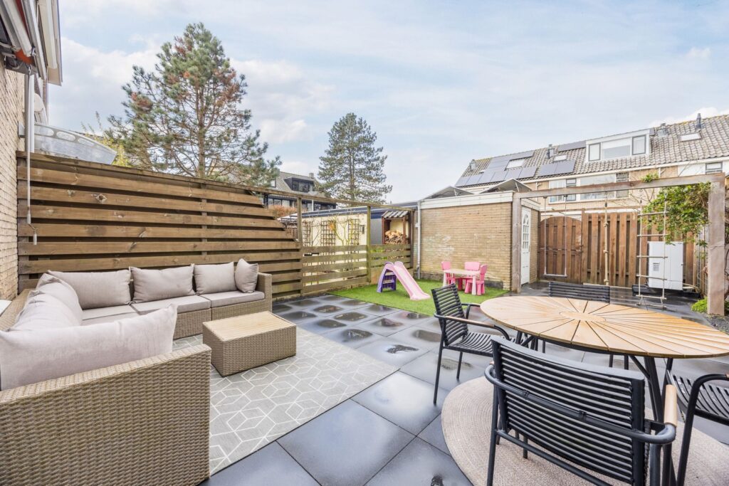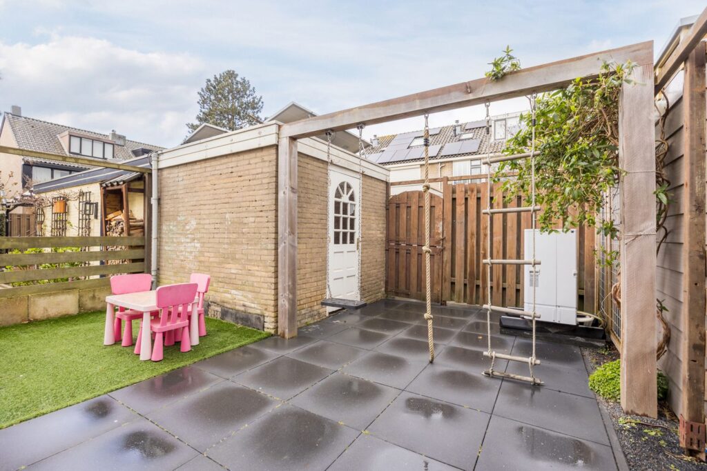 De tuin is modern aangelegd met antraciet tegels, kunstgras en een speelelement met schommel. Perfect voor gezinnen met kinderen. Daarnaast beschikt de tuin over een praktische berging.