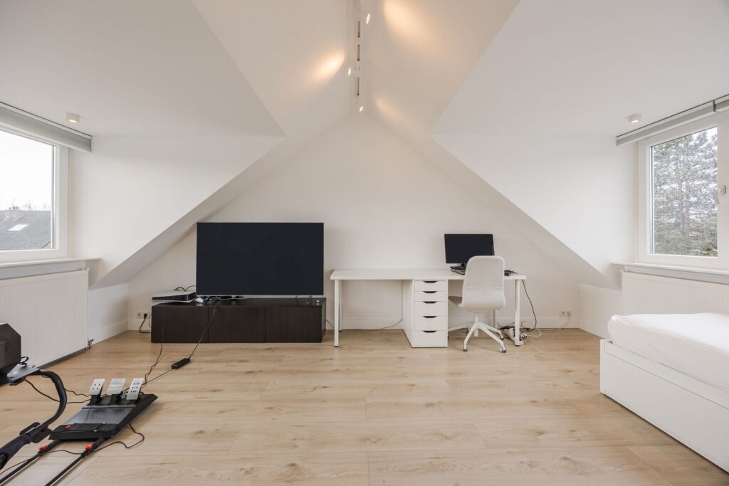 De tweede verdieping biedt nog eens extra ruimte en mogelijkheden. Dankzij de aanwezigheid van twee dakkapellen is hier een volwaardige verdieping ontstaan met een ruime overloop, technische ruimte met was opstelling en een vierde slaapkamer. Desgewenst is hier eenvoudig een vijfde slaapkamer te realiseren, ideaal voor grotere gezinnen, een thuiswerkplek of hobbyruimte.