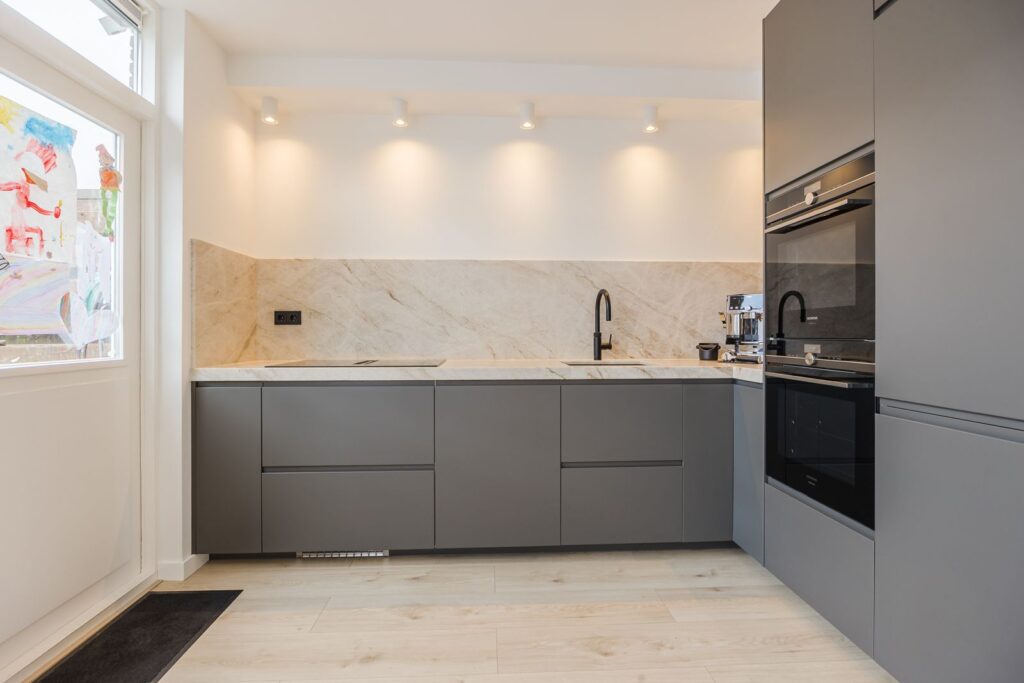 Aan de achterzijde bevindt zich de eyecatcher van de woning: de luxe open keuken. Deze recent geplaatste keuken is uitgevoerd met een prachtig Taj Mahal werkblad en voorzien van hoogwaardige Siemens Studioline inbouwapparatuur. Denk aan een inductiekookplaat met geïntegreerde afzuiging, dubbele (stoom) oven, Quooker en een complete opstelling die zowel esthetisch als functioneel op hoog niveau is. Een perfecte plek voor kookliefhebbers en gezellige avonden met familie en vrienden.