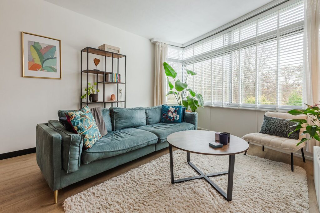 De lichte woonkamer heeft een brede raampartij met vrij uitzicht op het groen.