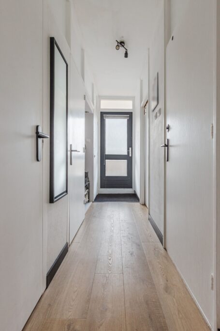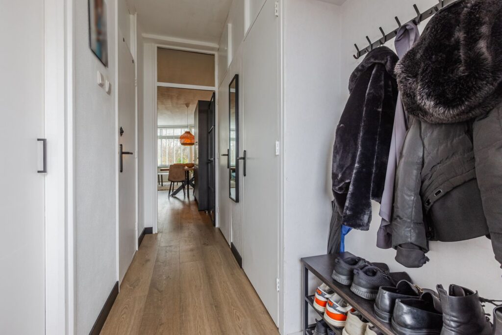 Via de centrale entree bereikt u het trappenhuis en de lift. Op de tweede verdieping geeft de galerij toegang tot het appartement. U komt binnen in de hal met praktische opbergkasten en toegang tot alle vertrekken.