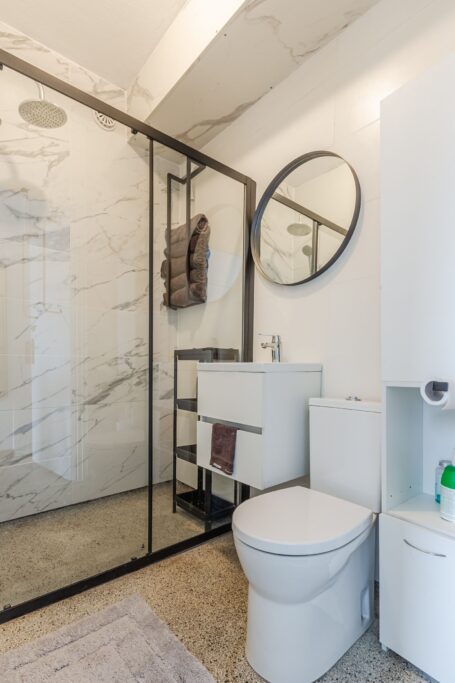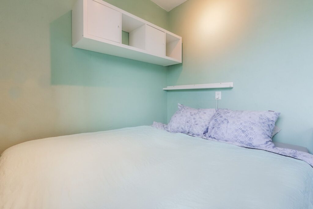 De slaapkamer ligt aan de galerijzijde. De gerenoveerde badkamer is uitgerust met een inloopdouche, wastafel en toilet. Op de begane grond beschikt u over een privéberging, ideaal voor fiets en opslag.
