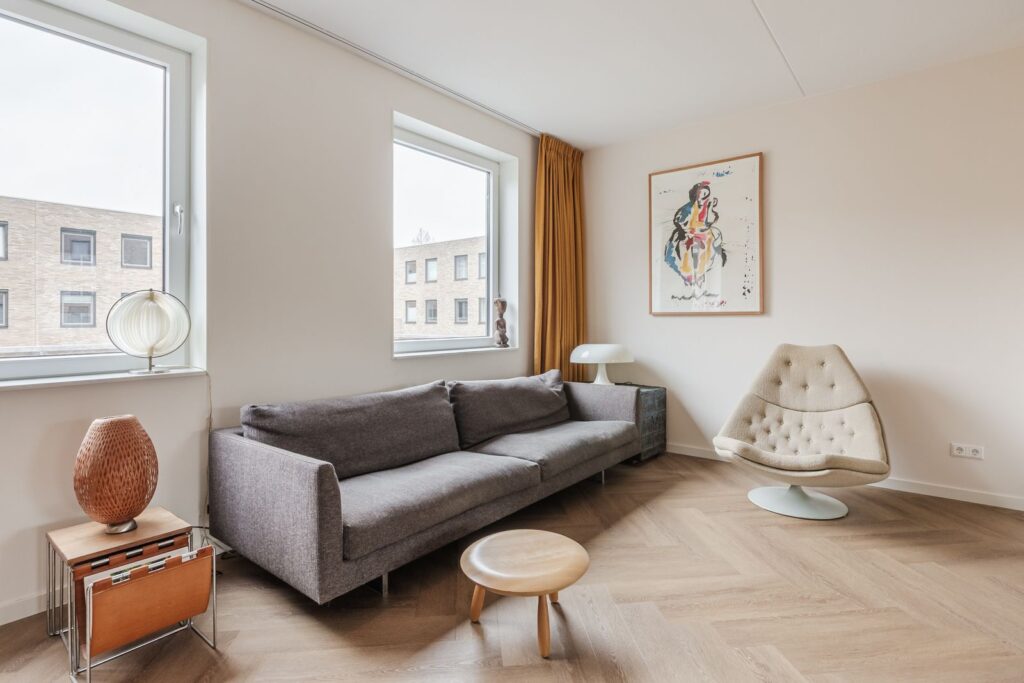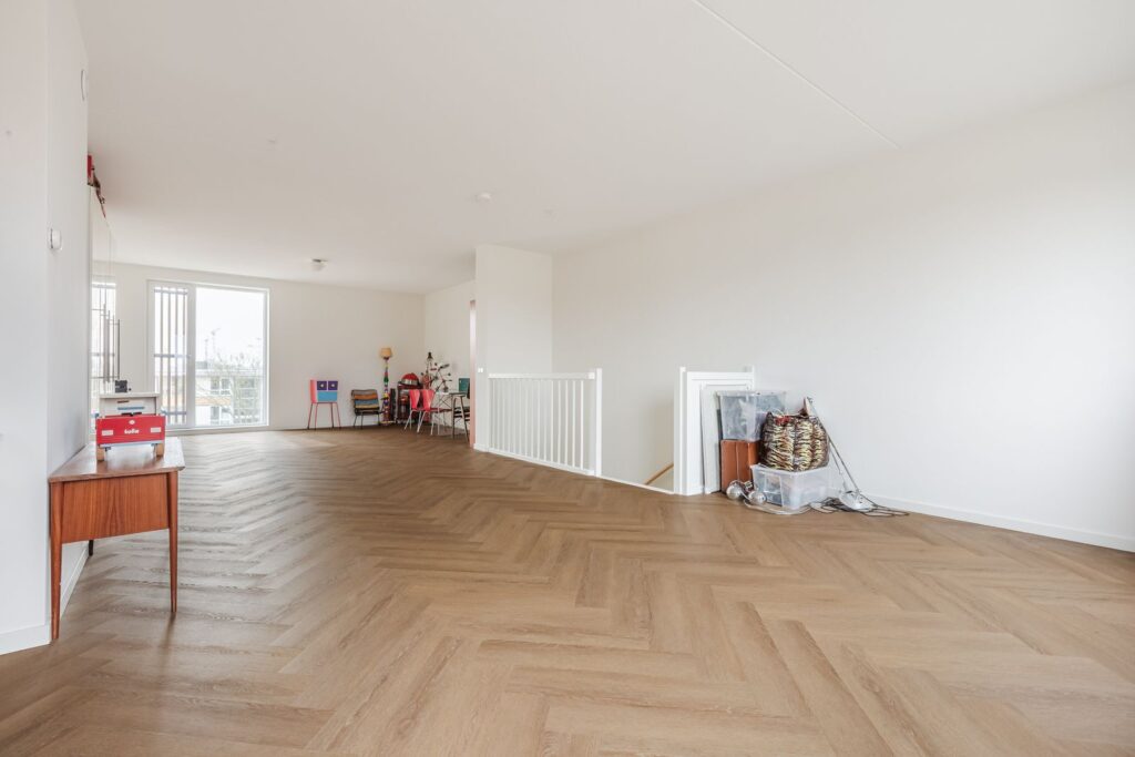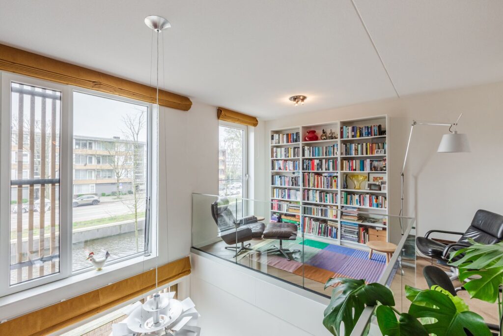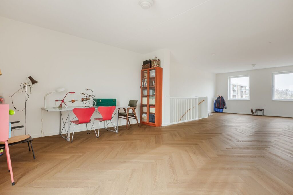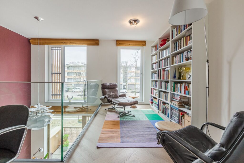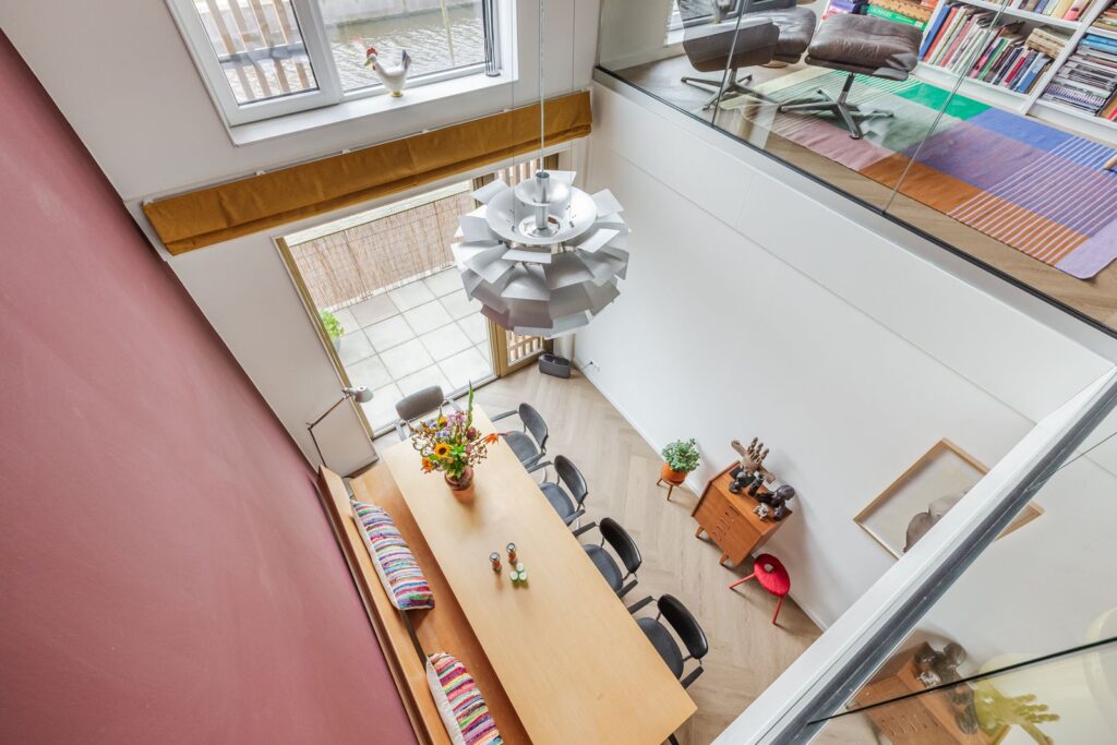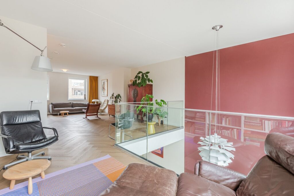 Hier bevindt zich een royale woonkamer van 46 m2 die door de vide verbonden is met de woonkeuken op de begane grond.