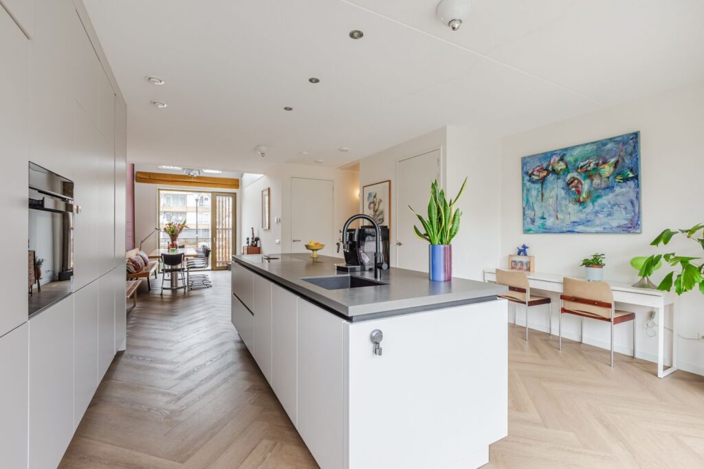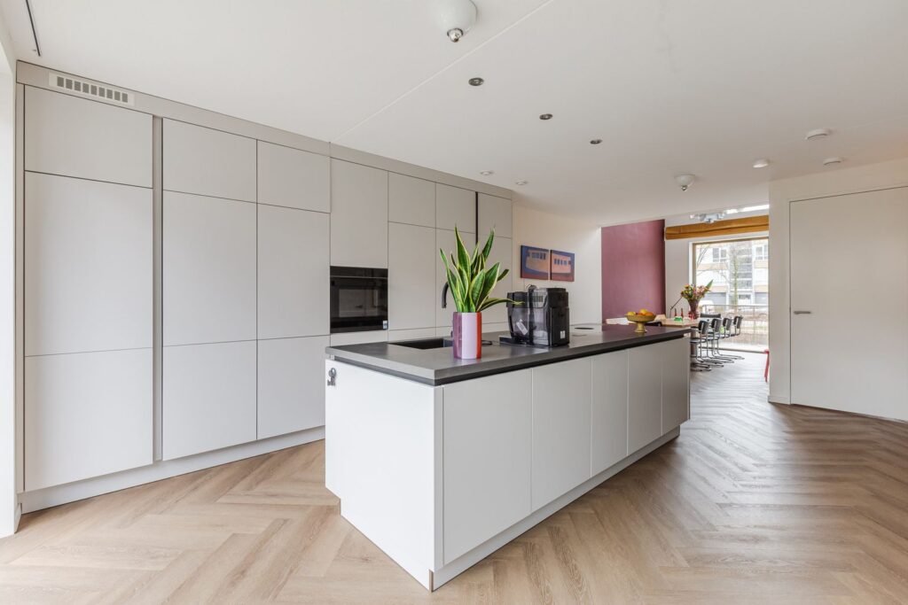 Moderne woonkeuken met een stijlvol kookeiland voorzien van koelkast, vriezer, vaatwasser, oven, Quooker en Bora inductiekookplaat met geïntegreerde afzuiging.