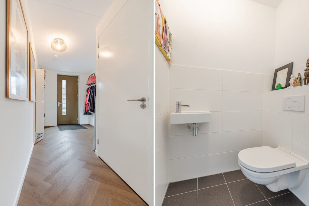 Ruime entree/hal met meterkast en een modern zwevend toilet met fonteintje.