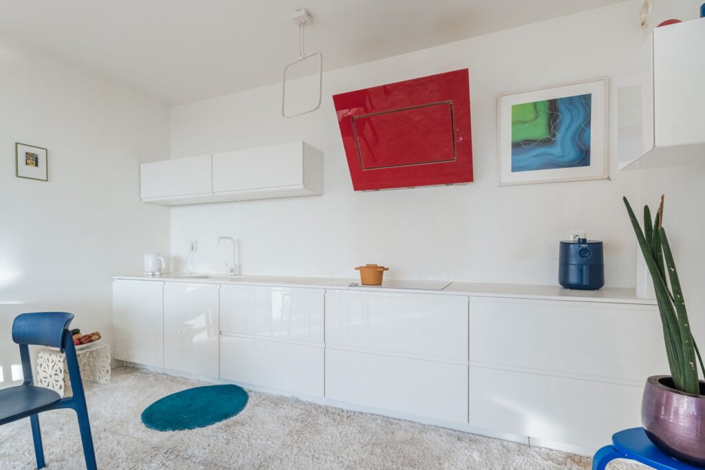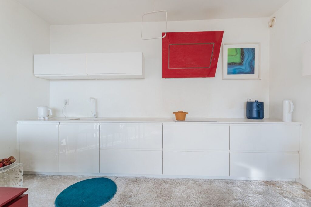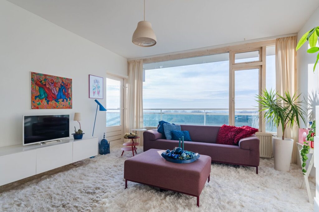 De lichte woonkamer heeft een open keuken, een deur naar het balkon en een wow-uitzicht. Als de zon schijnt zie je in de verte een reep zee glinsteren.