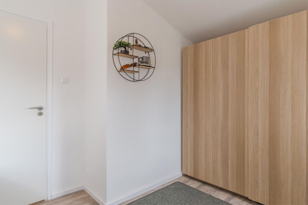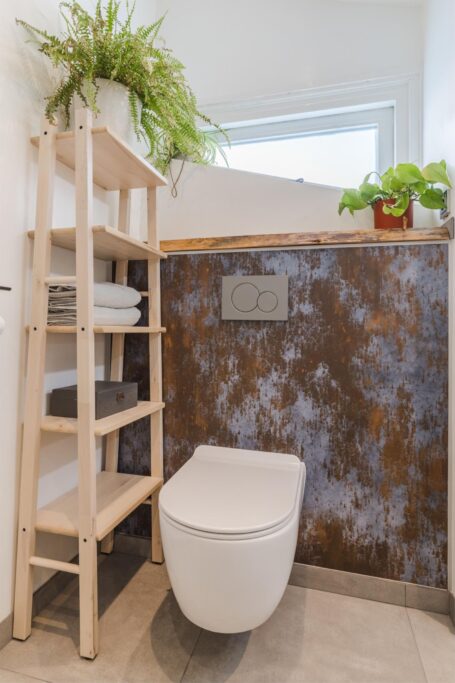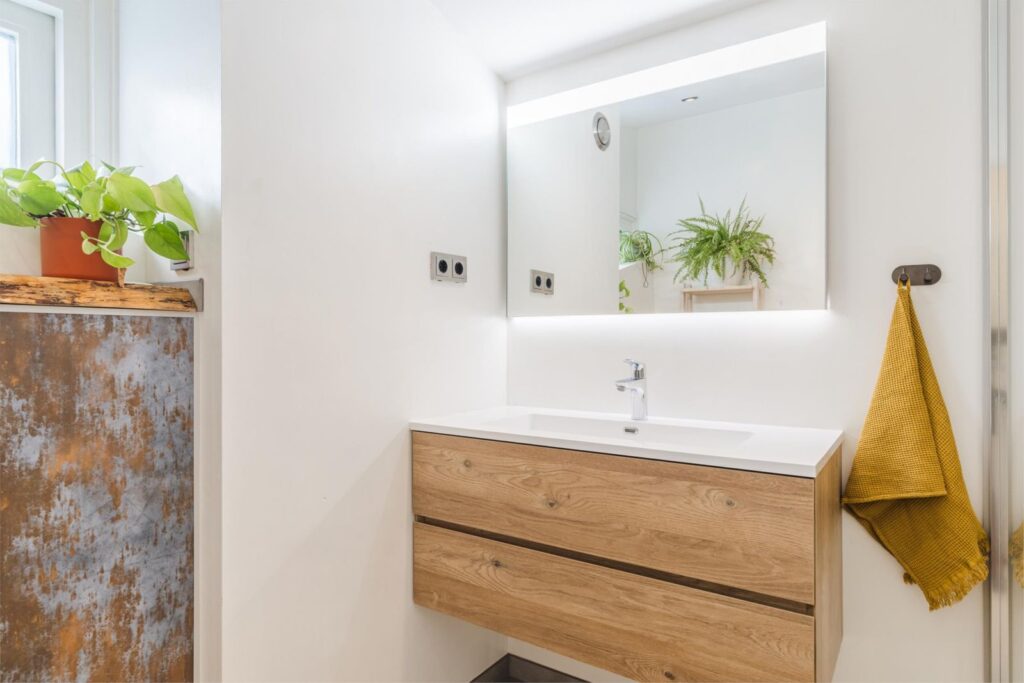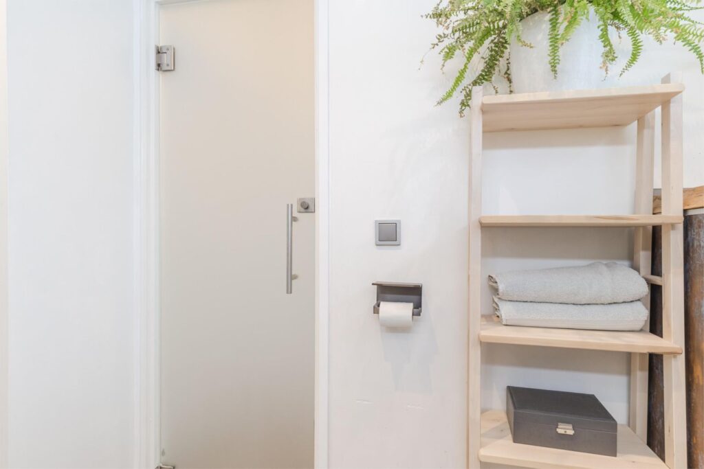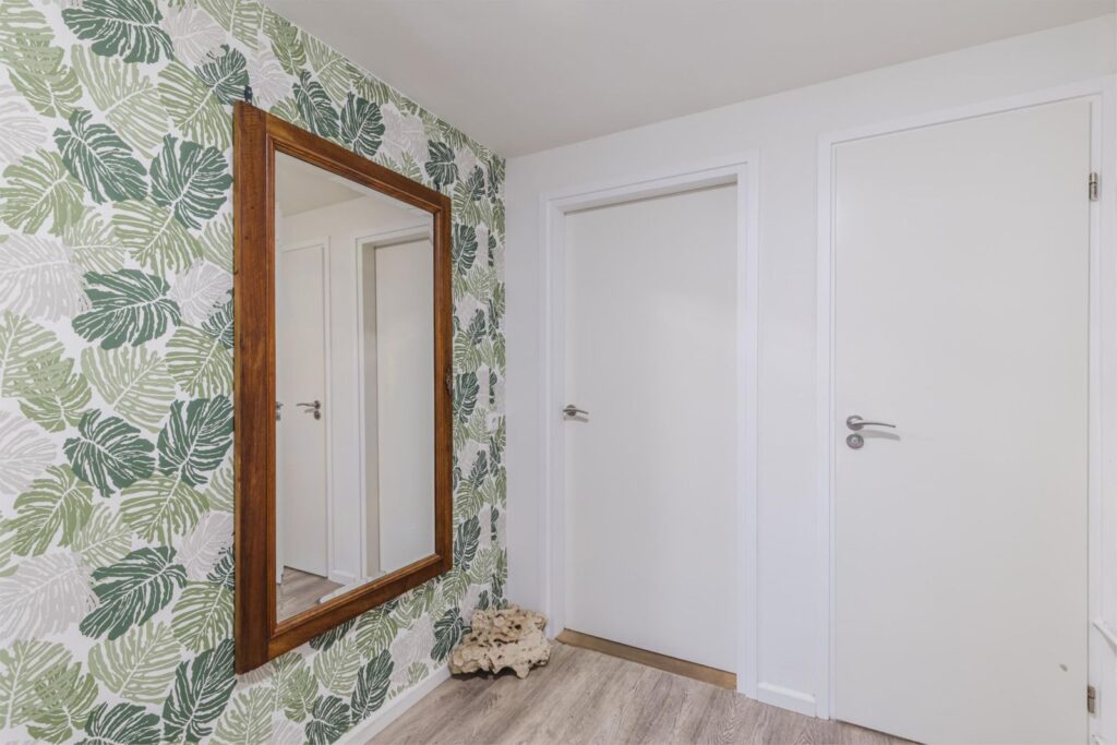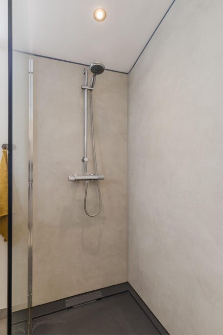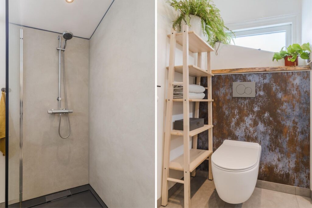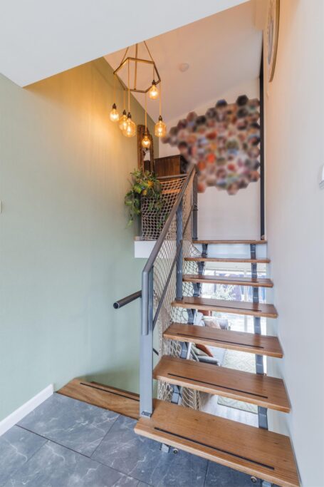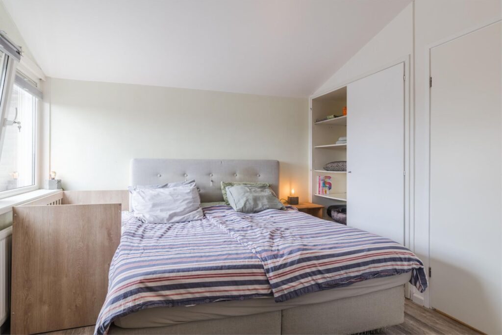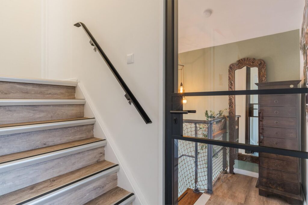 Op de eerste slaapverdieping vind je twee slaapkamers en een overloop met stijlvolle stalen tussendeur met glas. Een halve verdieping hoger ligt de royale master bedroom, voorzien van airconditioning en een ingebouwde én losse kast. Hier bevindt zich ook de luxe badkamer (2025 vernieuwd en vergroot) met inbouwspots, moderne wastafel en royale douchecabine.