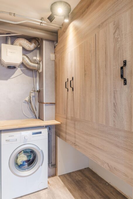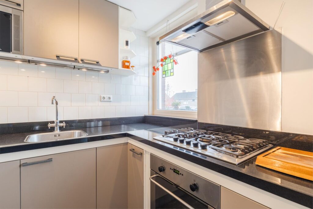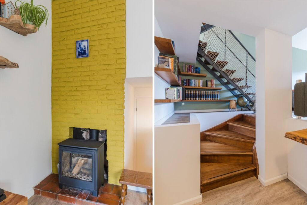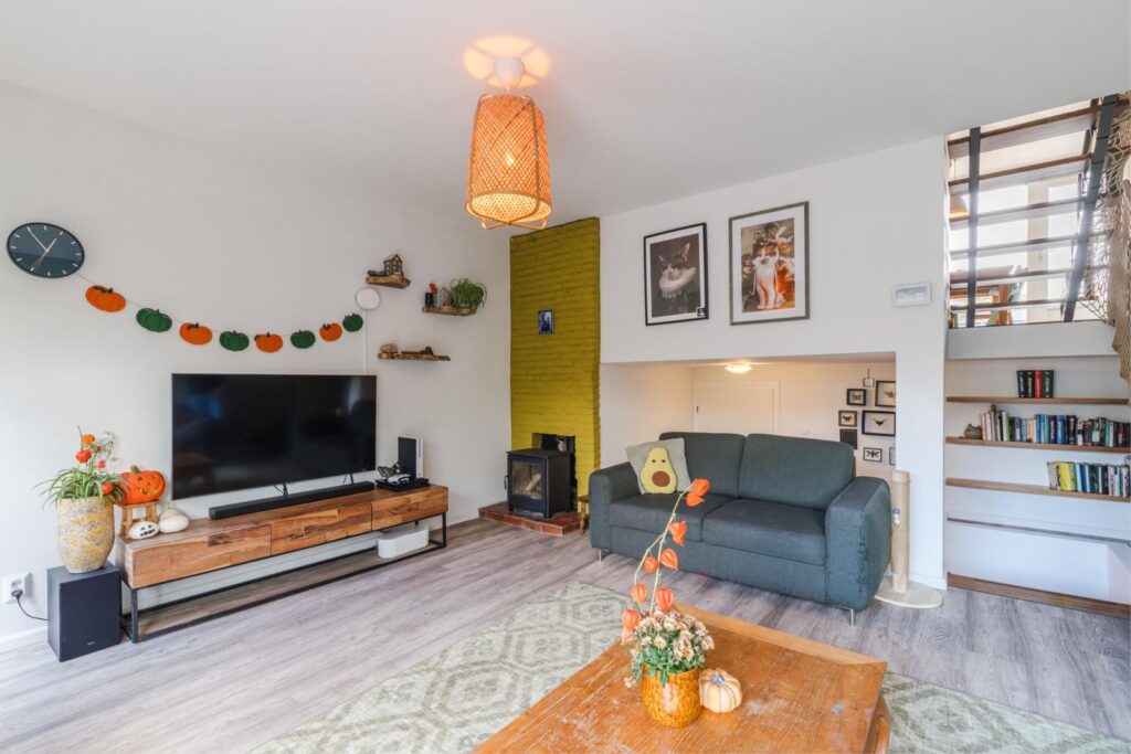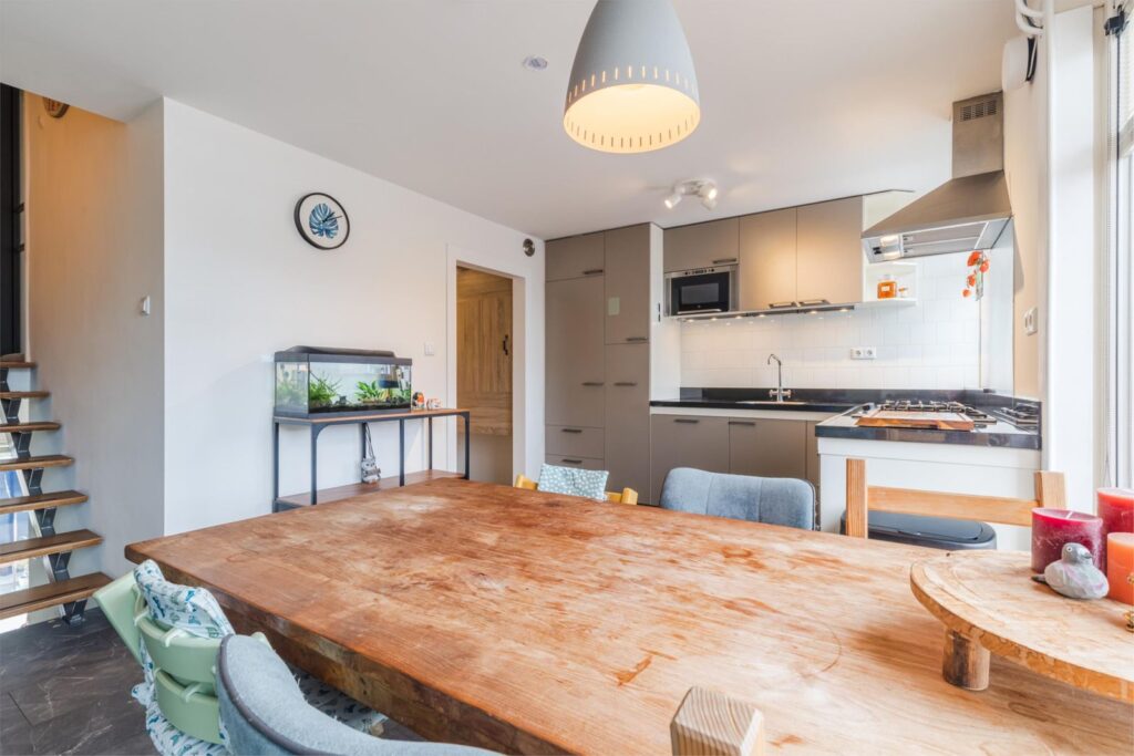 Via een korte trap kom je in de lichte woonkamer met grote ramen en toegang tot de zonnige tuin en een gezellige houtkachel. Een trap hoger ligt de keuken, voorzien van compleet vernieuwde look en deuren (2021), een ruime bijkeuken met veel bergruimte (2025 vernieuwd) en toegang tot het balkon aan de voorzijde. Deze open indeling zorgt voor een speels en licht geheel, ideaal voor zowel gezinnen als stellen.