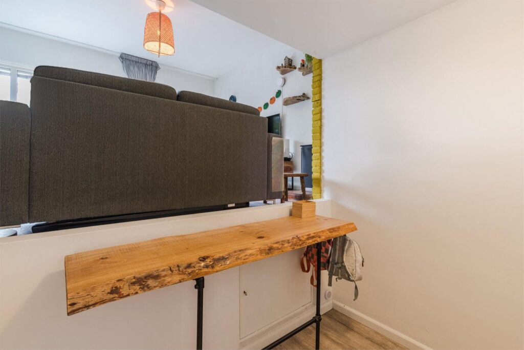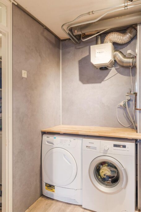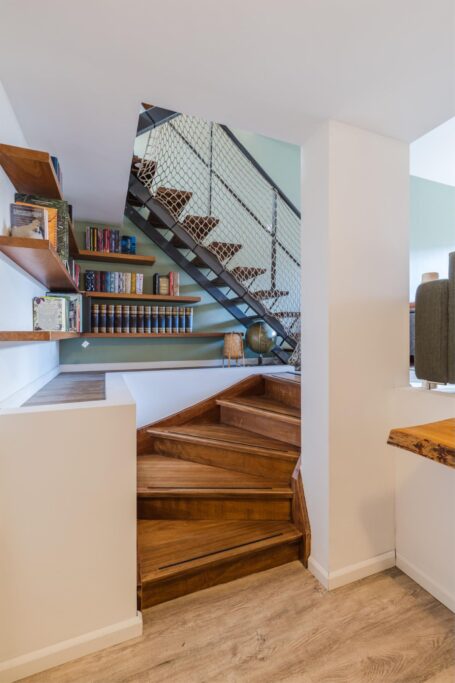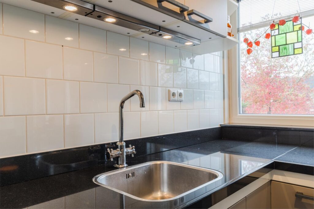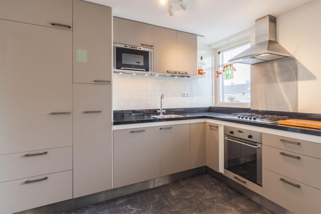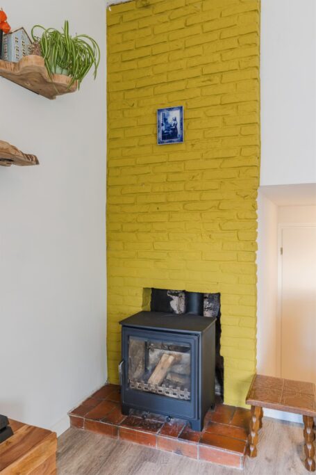 Via een korte trap kom je in de lichte woonkamer met grote ramen en toegang tot de zonnige tuin en een gezellige houtkachel. Een trap hoger ligt de keuken, voorzien van compleet vernieuwde look en deuren (2021), een ruime bijkeuken met veel bergruimte (2025 vernieuwd) en toegang tot het balkon aan de voorzijde. Deze open indeling zorgt voor een speels en licht geheel, ideaal voor zowel gezinnen als stellen.