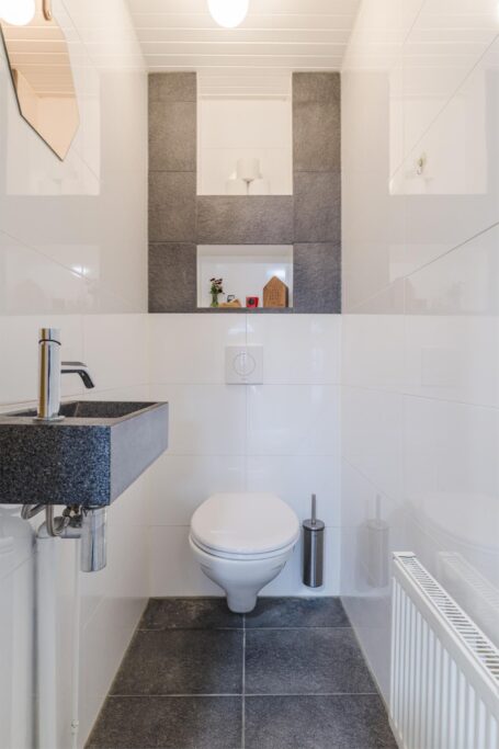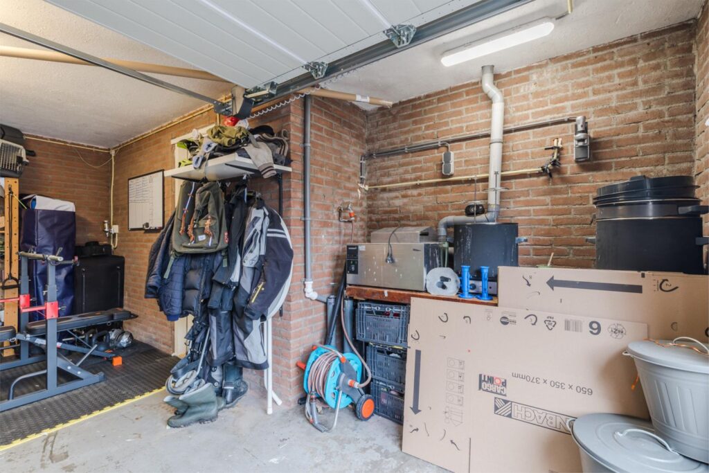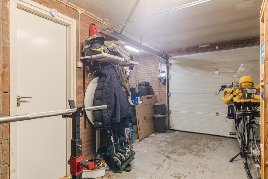 Bij binnenkomst tref je de entree met toegang tot de garage, een separate toiletruimte en de trap naar de woonverdieping. De garage beschikt over een elektrische, geïsoleerde deur en biedt volop ruimte voor auto, fietsen of opslag.
