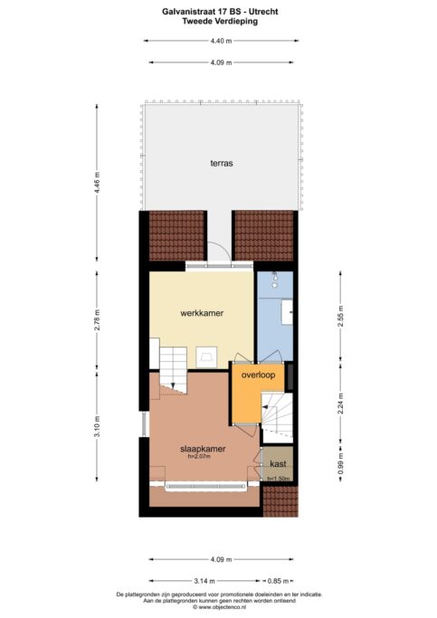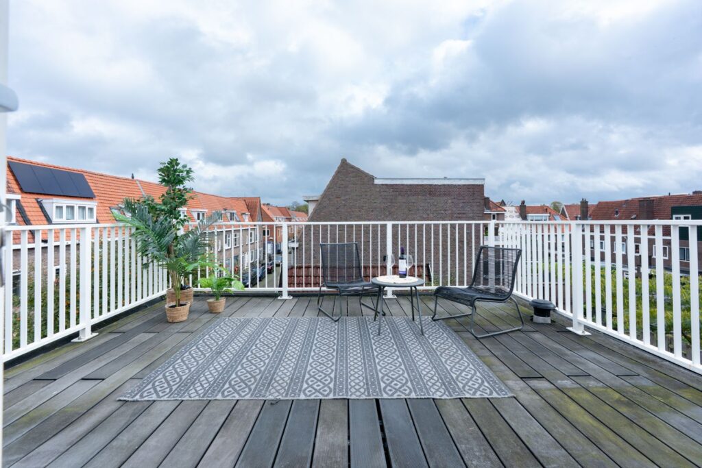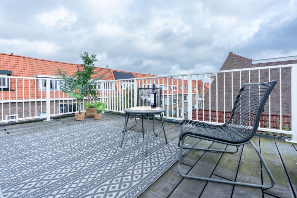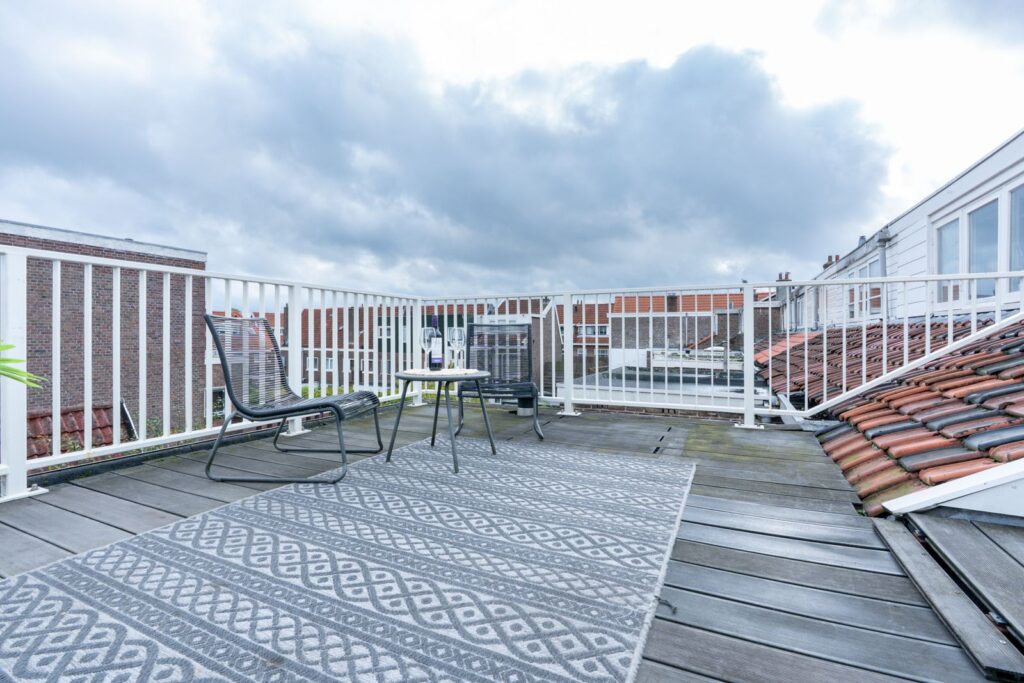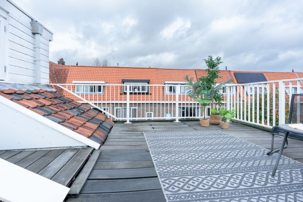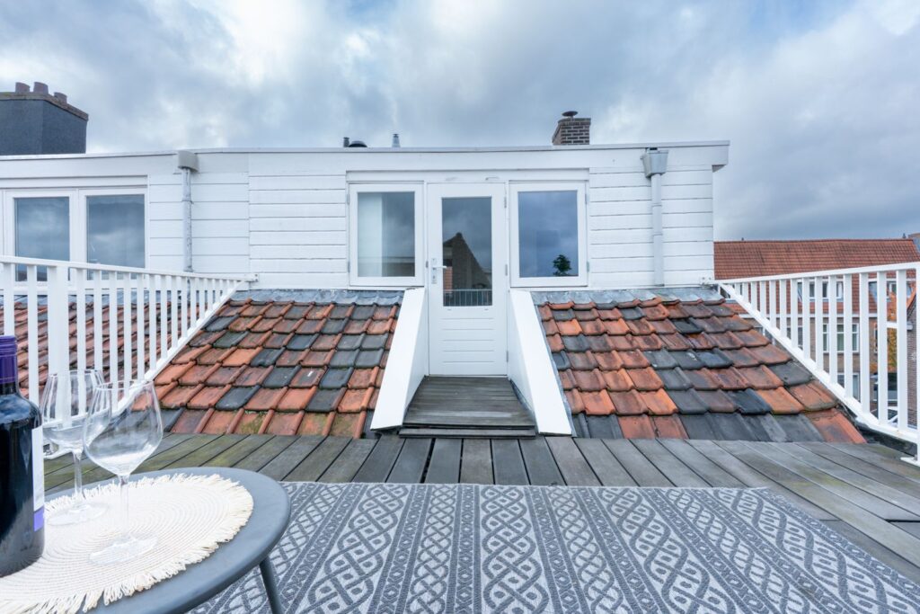 Het royale dakterras ligt op het noordoosten en is een heerlijke plek om van de gehele dag van de zon te genieten. Er is ruimte genoeg voor een eettafel, loungehoek en planten.