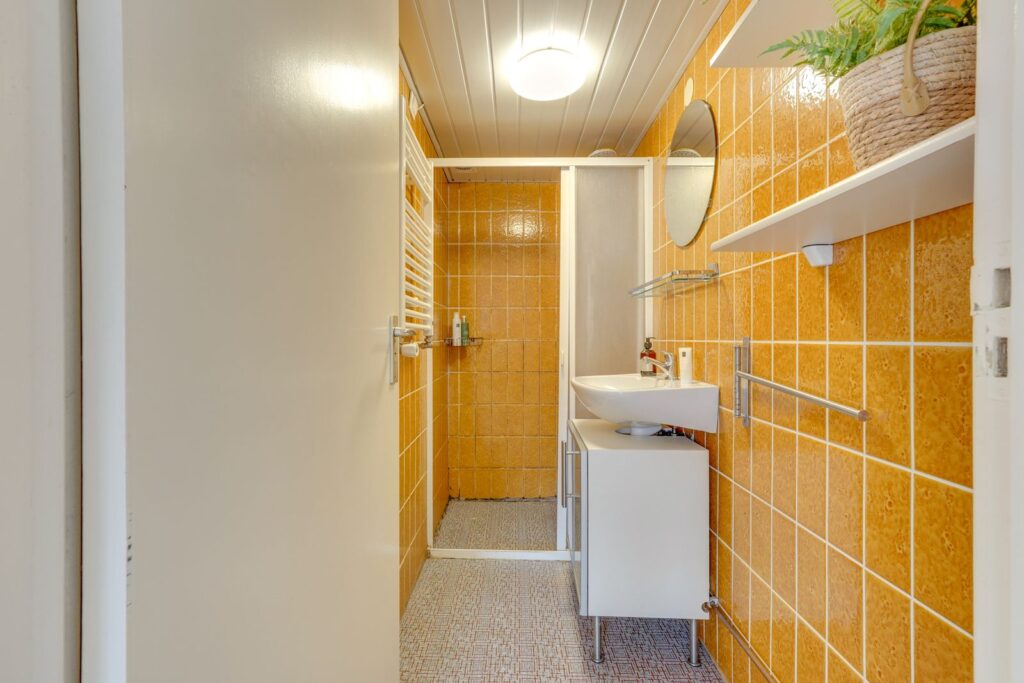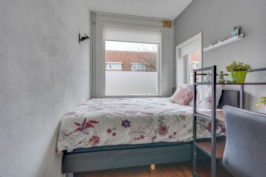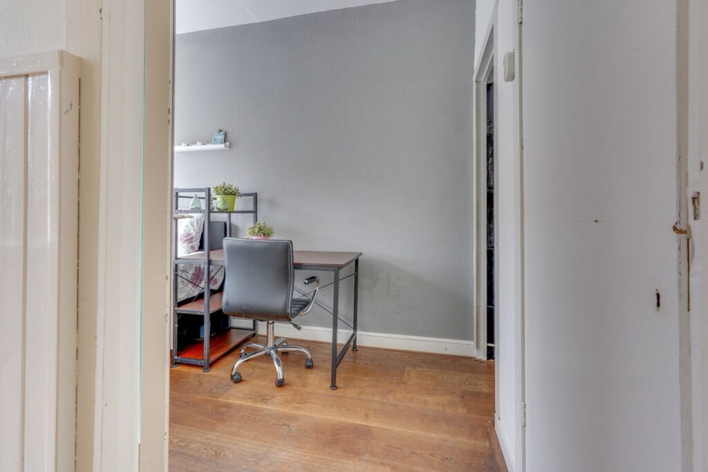 Op deze verdieping bevinden zich twee kamers en de badkamer. De kamer aan de voorzijde is in gebruik als slaapkamer en beschikt over een inbouwkast. De kamer aan de achterzijde beschikt over een wasmachineaansluiting en wordt nu gebruikt als werkruimte en biedt toegang tot het heerlijke dakterras. De badkamer is eenvoudig maar netjes, met een douche en wastafel.
