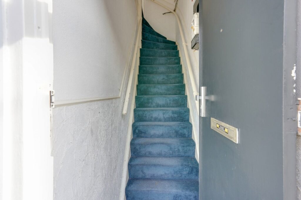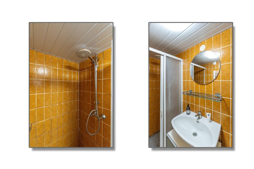On this floor, you’ll find two rooms and the bathroom. The front room serves as a bedroom and includes a built-in wardrobe. The rear room, currently used as a workspace, features a washing machine connection and provides access to the lovely rooftop terrace. The bathroom is simple but tidy, fitted with a shower and sink.