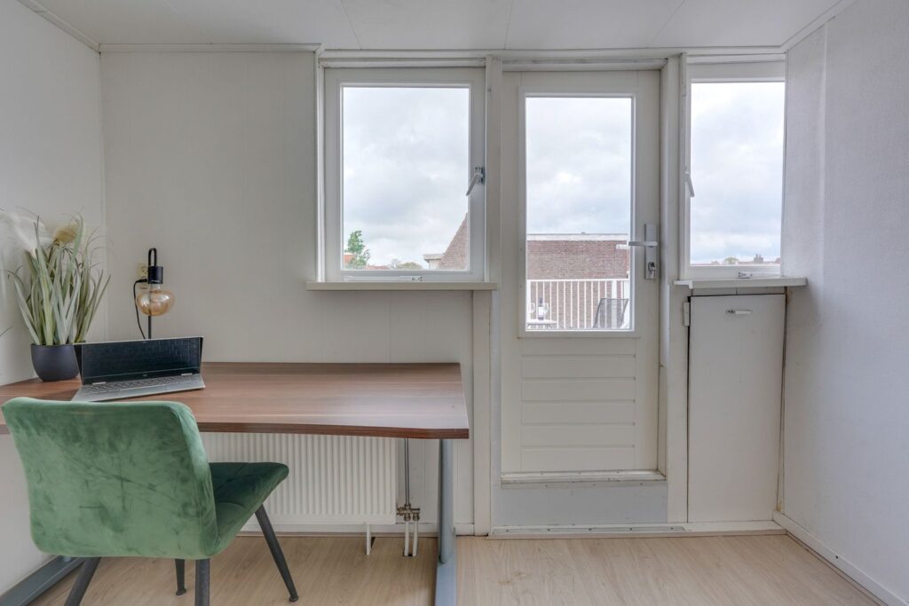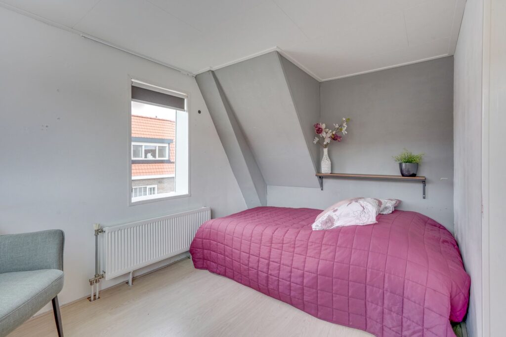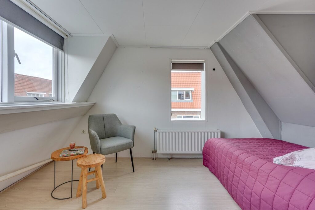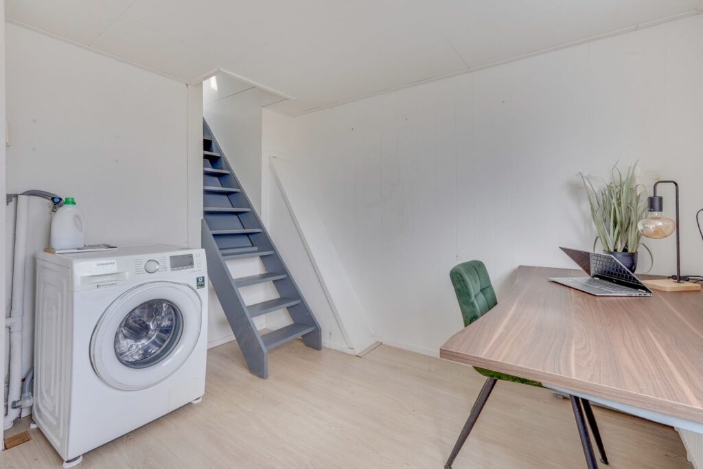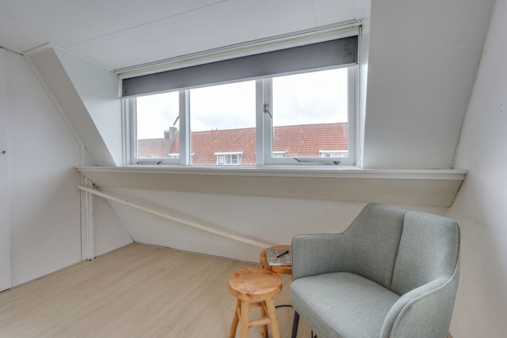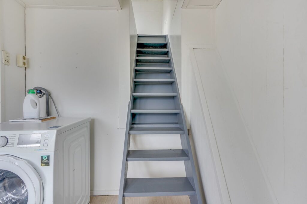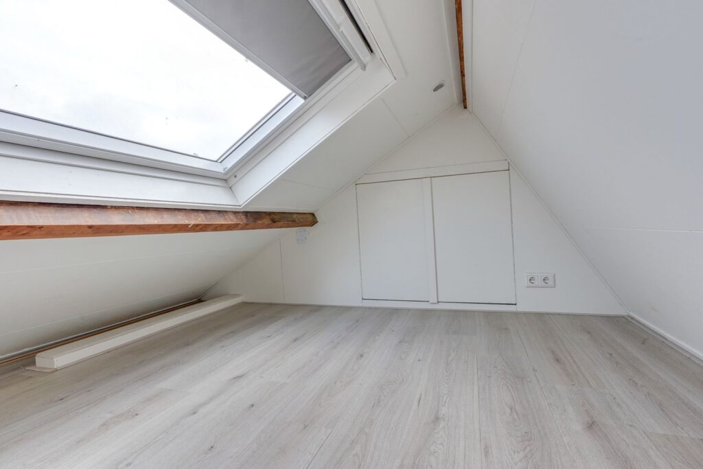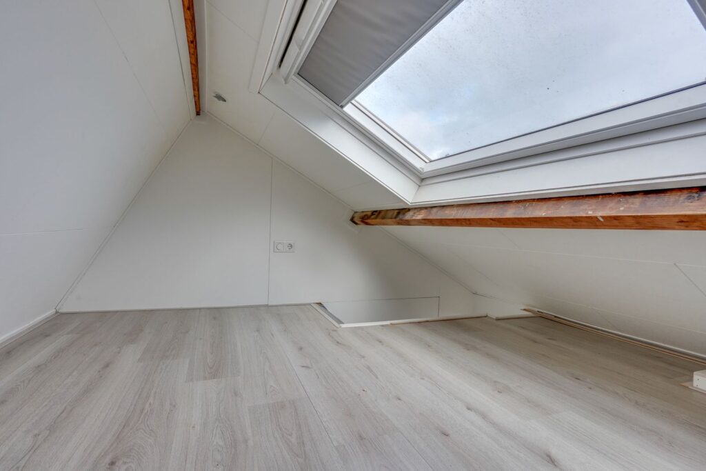 Via een vaste trap in de slaap/werkkamer bereik je de zolderverdieping, ideaal als bergzolder of logeerplek. Hier bevindt zich ook extra bergruimte achter knieschotten.