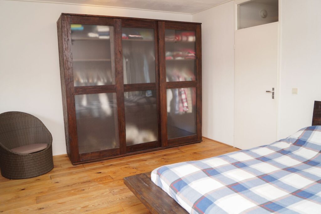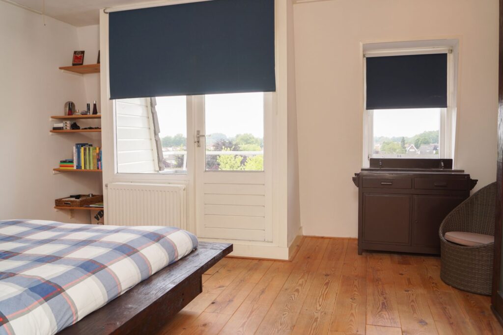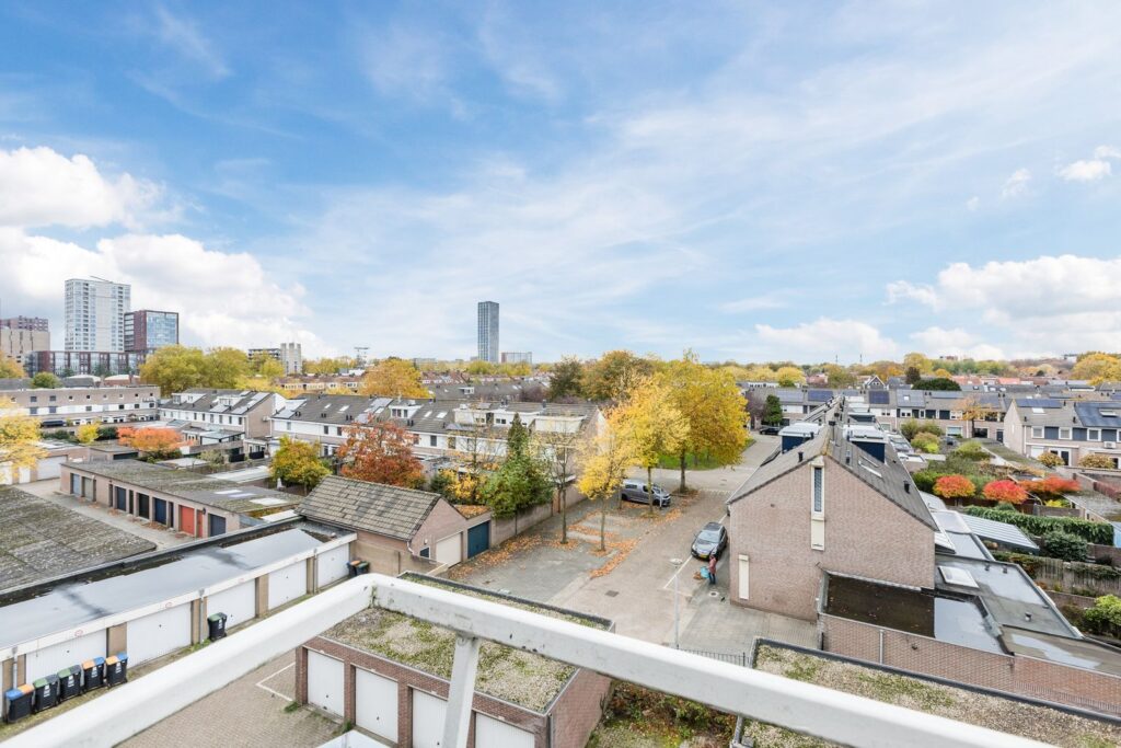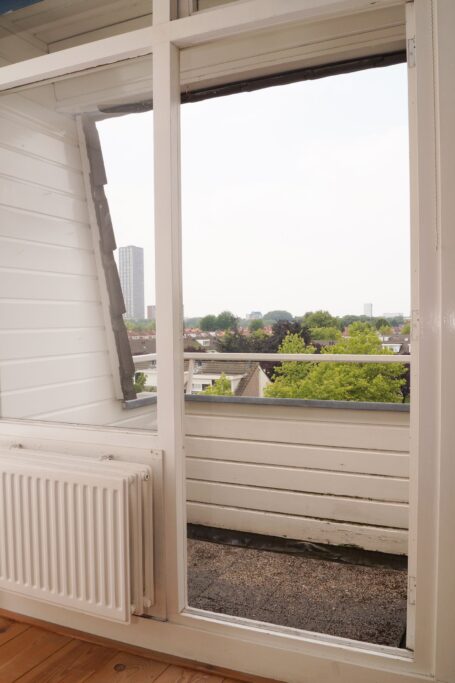 Het balkon ligt op het westen en biedt uitzicht op een rustige woonomgeving — ideaal voor een kop koffie in de ochtend of een glas wijn in de avond.