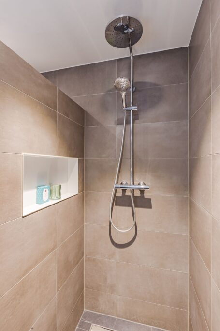 Op de overloop vind je twee slaapkamers en een vernieuwde badkamer met douche, wastafel en toilet. De ruime hoofdslaapkamer is gerealiseerd door twee kamers samen te voegen en kan desgewenst weer eenvoudig teruggebracht worden naar twee aparte slaapkamers, ideaal als je een extra (kinder)kamer of werkkamer wilt creëren.
