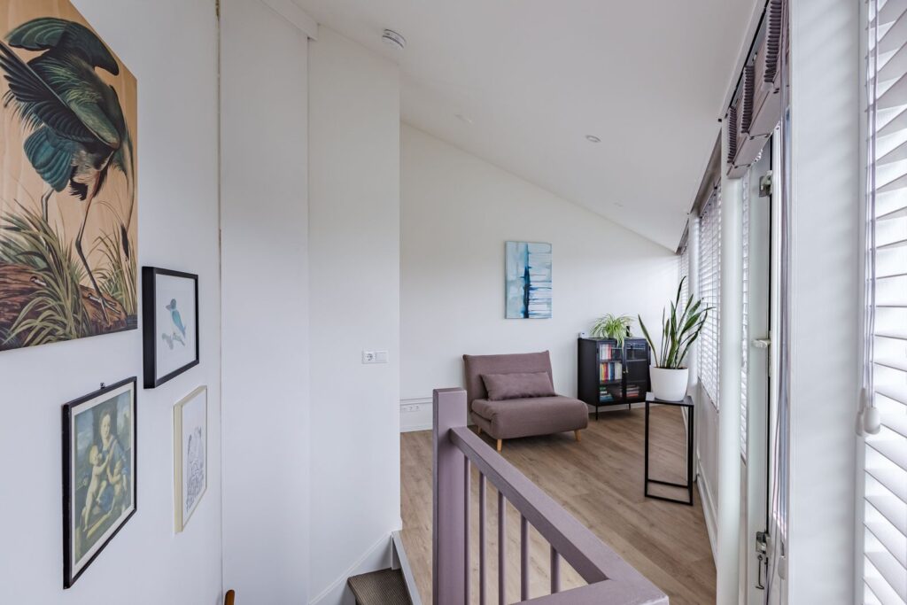 De tweede verdieping biedt een ruime zolderslaapkamer met een deur naar het privacyrijke dakterras (26 m²) op het zuidoosten – een heerlijke plek om tot rust te komen met vrij uitzicht. Een speciaal op maat gemaakte kast met schuifdeuren bergt de cv-ketel, wasmachine en extra spullen netjes weg – strak en overzichtelijk.