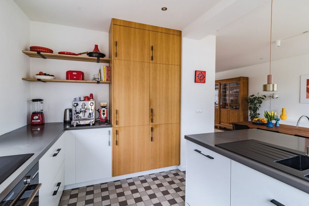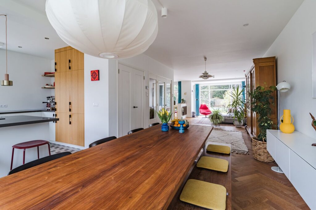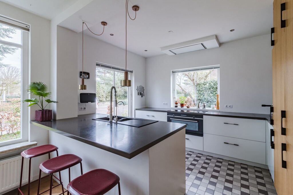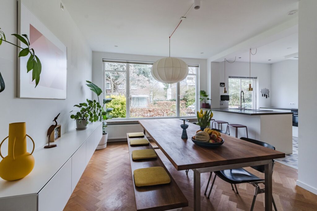 eikenhouten parketvloer en een open keuken met veel ramen. De keuken uit 2019 heeft
