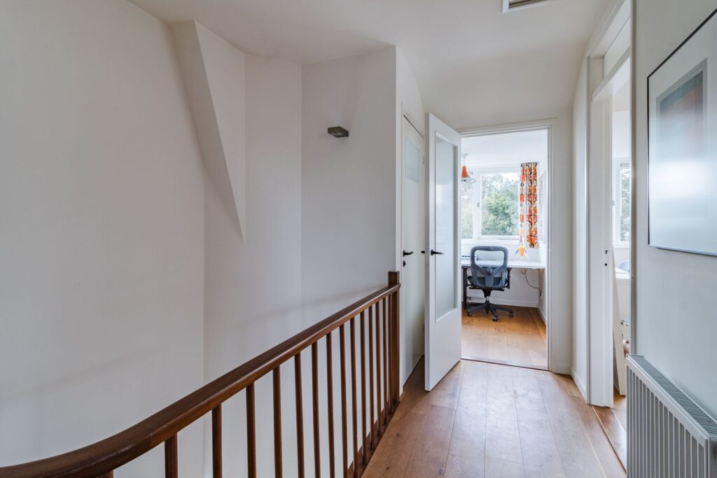 Via de trap bereikt u de ruime en lichte overloop, met toegang tot vier slaapkamers, de