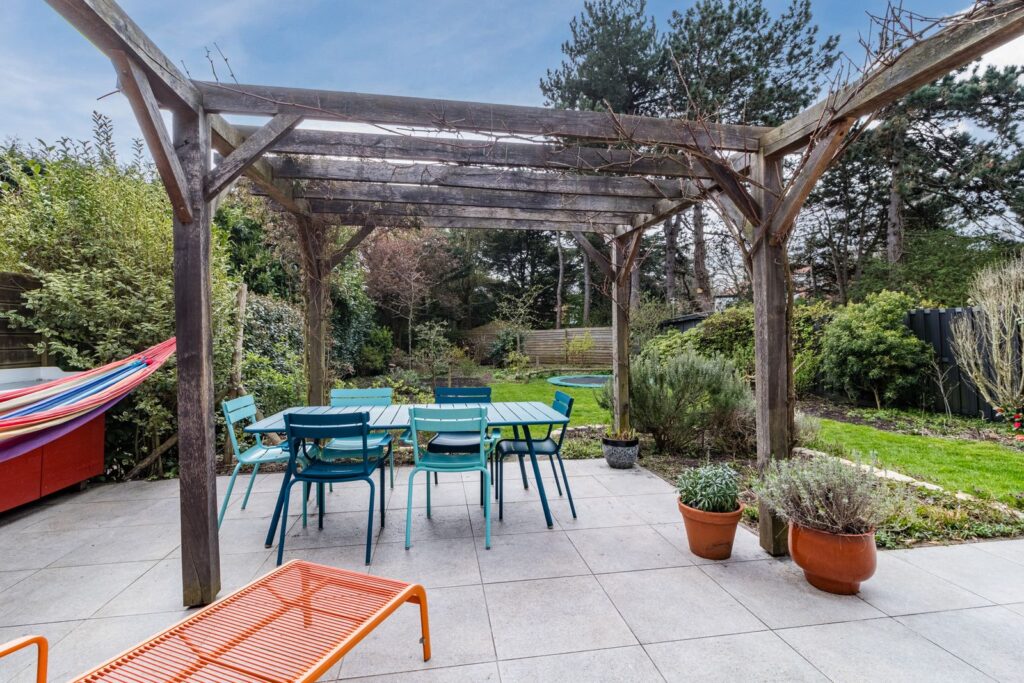 Het terras heeft een heerlijke beschutte zithoek en het oude washok is omgebouwd tot een