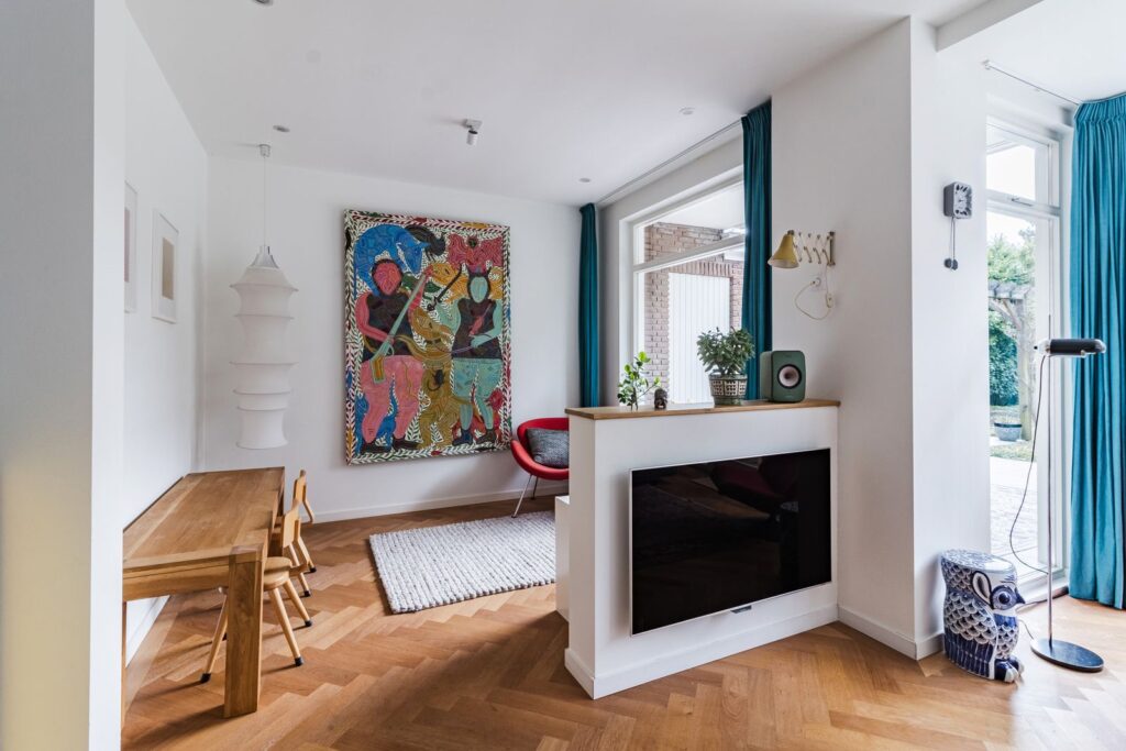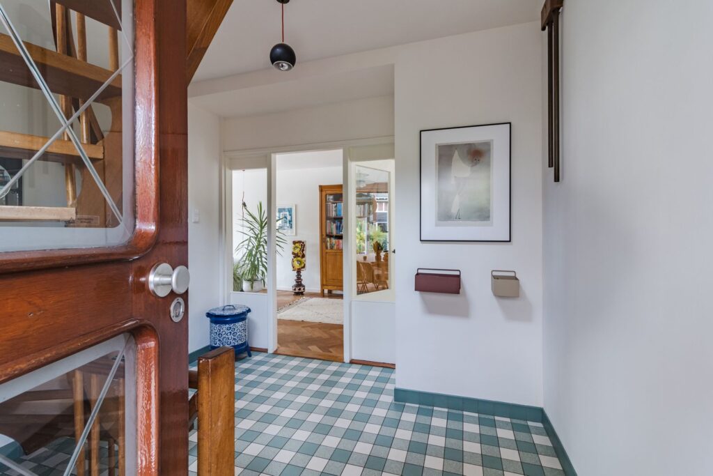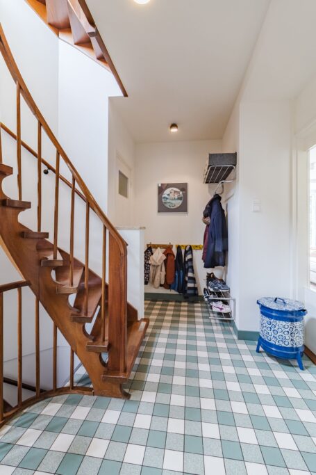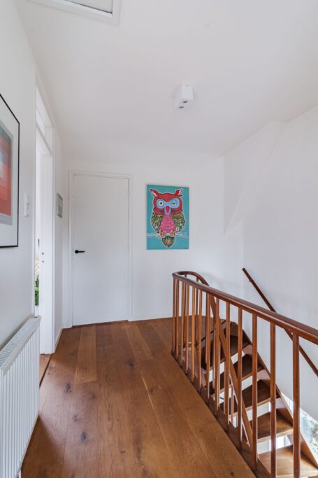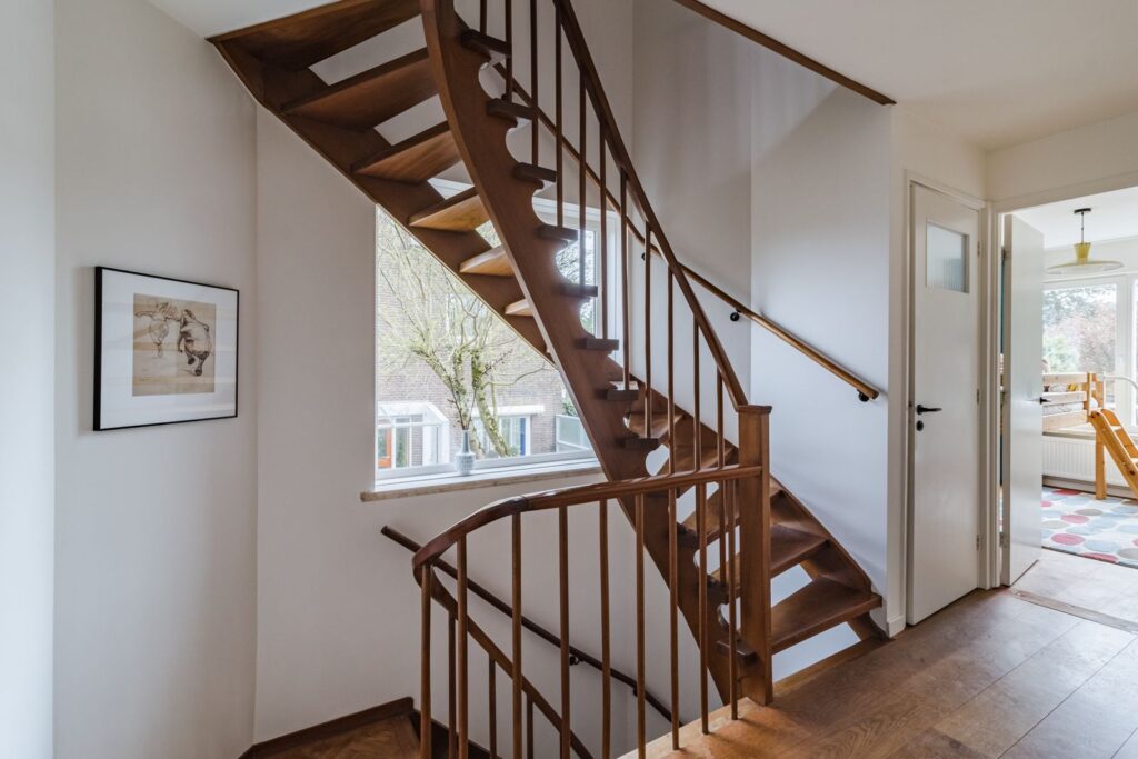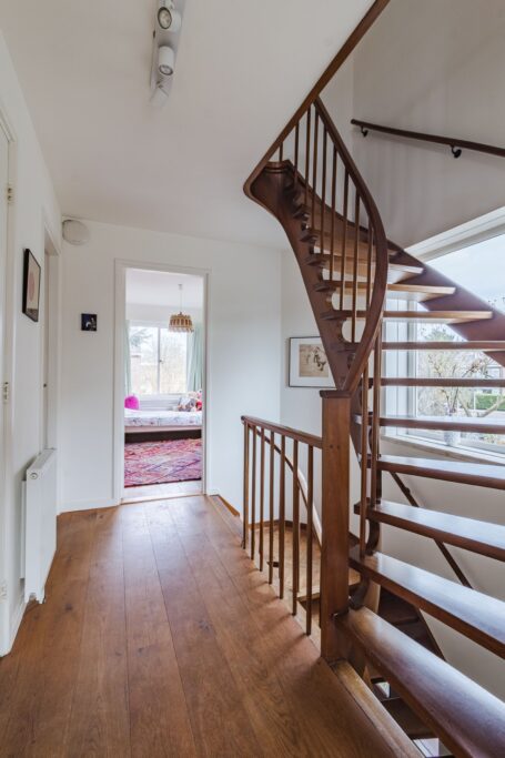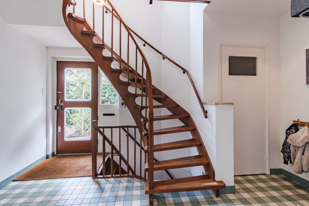 Bij binnenkomst valt direct de prachtige hardhouten trap op die uniek is voor dit huis.