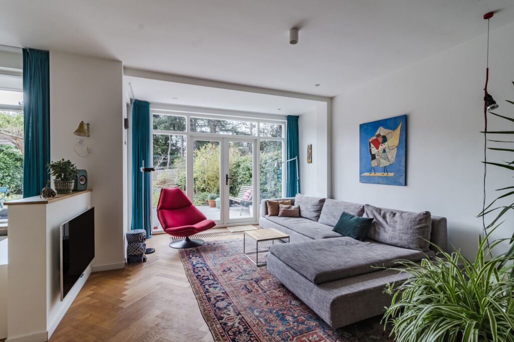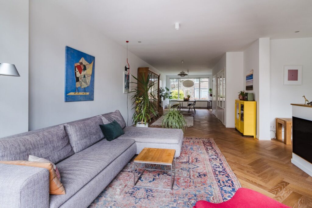 een deur met zijlichten naar de woonkamer. De ruime lichte L-vormige woonkamer heeft een
