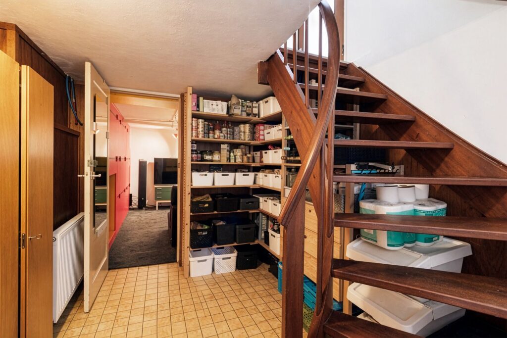 een tweede garderobe en voorraadkasten en toegang tot twee ruimtes: aan de voorkant een