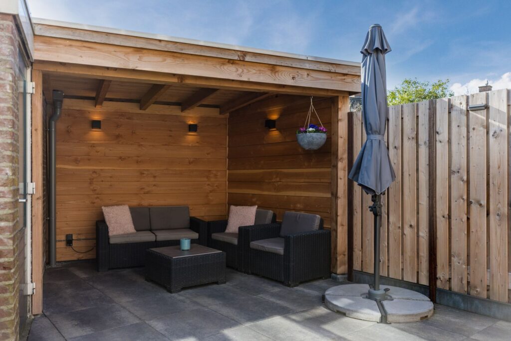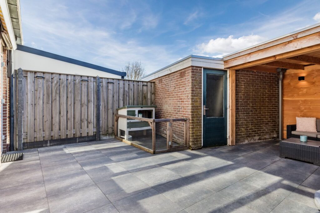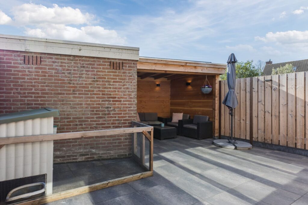 Ook bij minder weer zit je comfortabel onder de overkapping – perfect voor lange zomeravonden of een knusse herfst middag met een drankje en sfeerverlichting. De tuin beschikt daarnaast over een praktische berging en een eigen achterom.