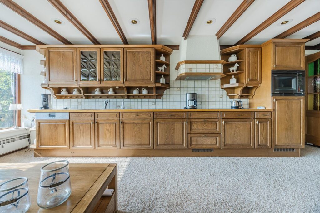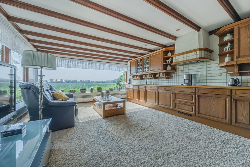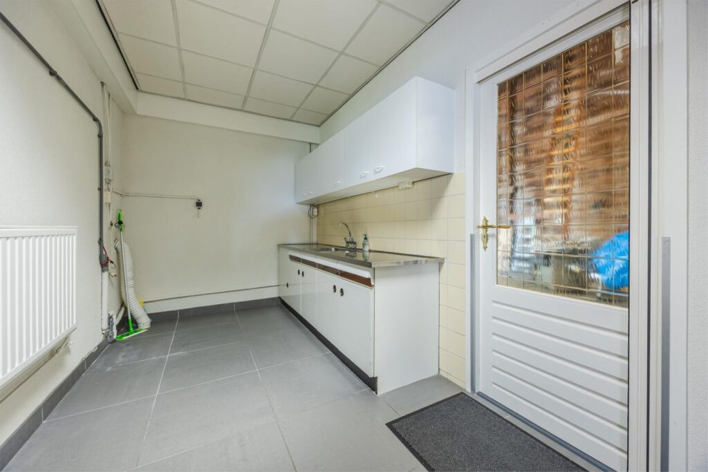 De royale woonkeuken beschikt eveneens over grote ramen en biedt een schitterend uitzicht over het omliggende landschap. Aansluitend bevindt zich een aparte praktische ruimte met wasmachineaansluiting en een eenvoudig extra keukenblok. Vanuit hier is er directe toegang tot de grote schuur.