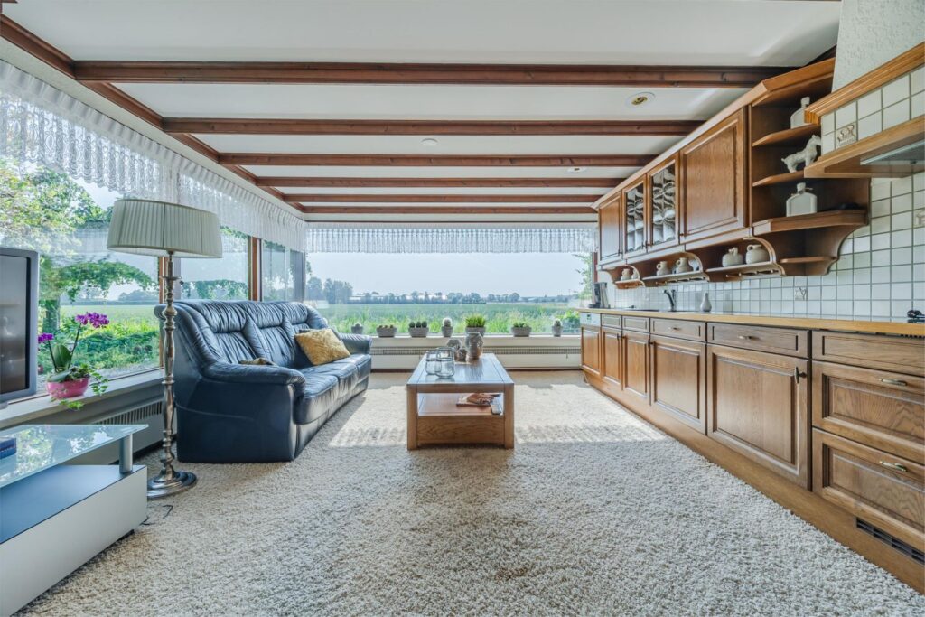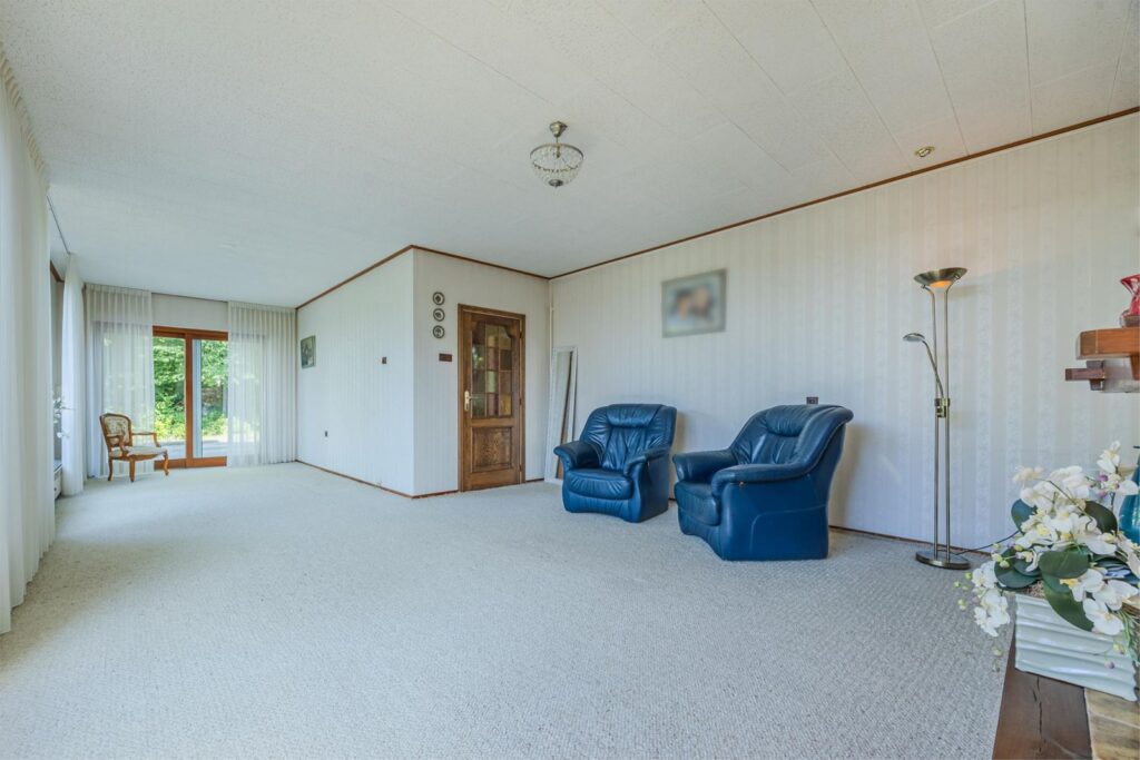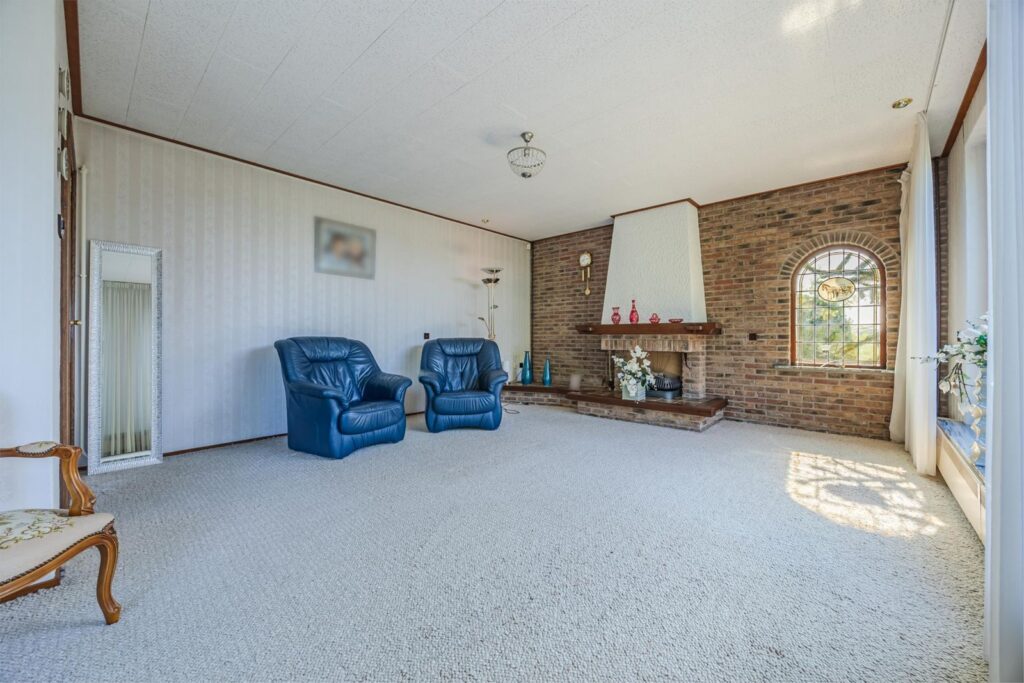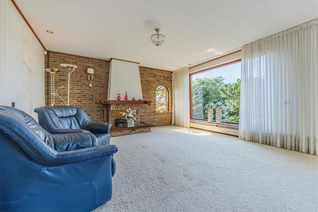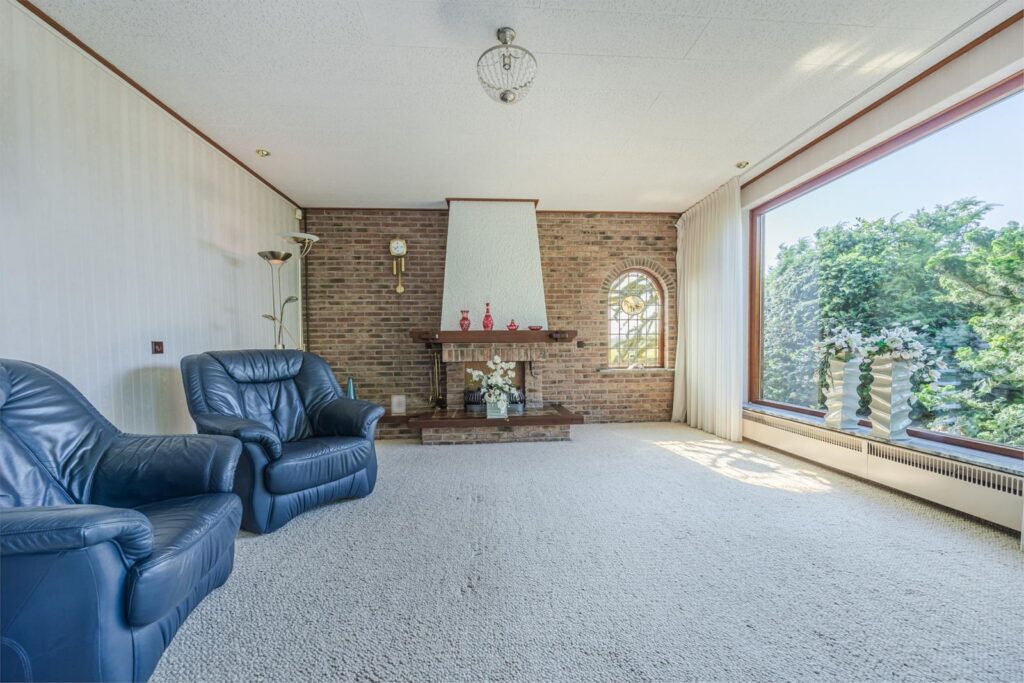De woonkamer is voorzien van een sfeervolle gas-openhaard en grote raampartijen rondom, waardoor u optimaal geniet van het prachtige uitzicht.