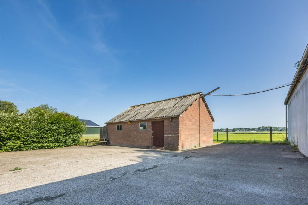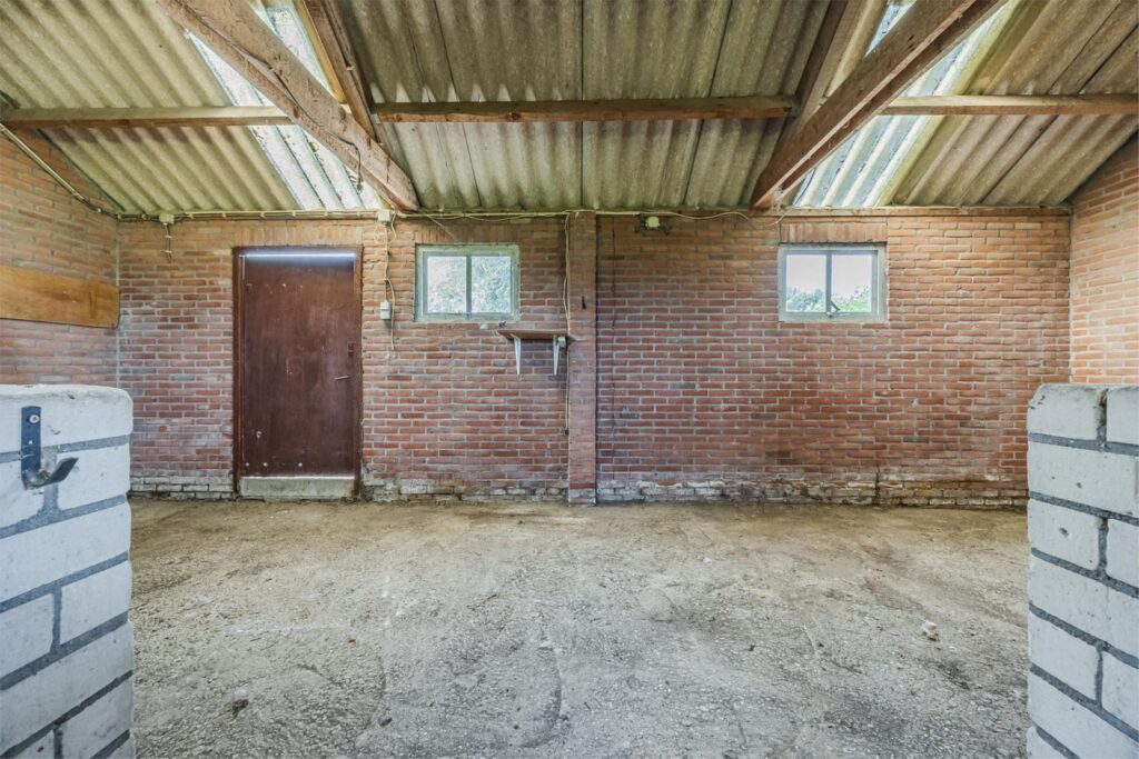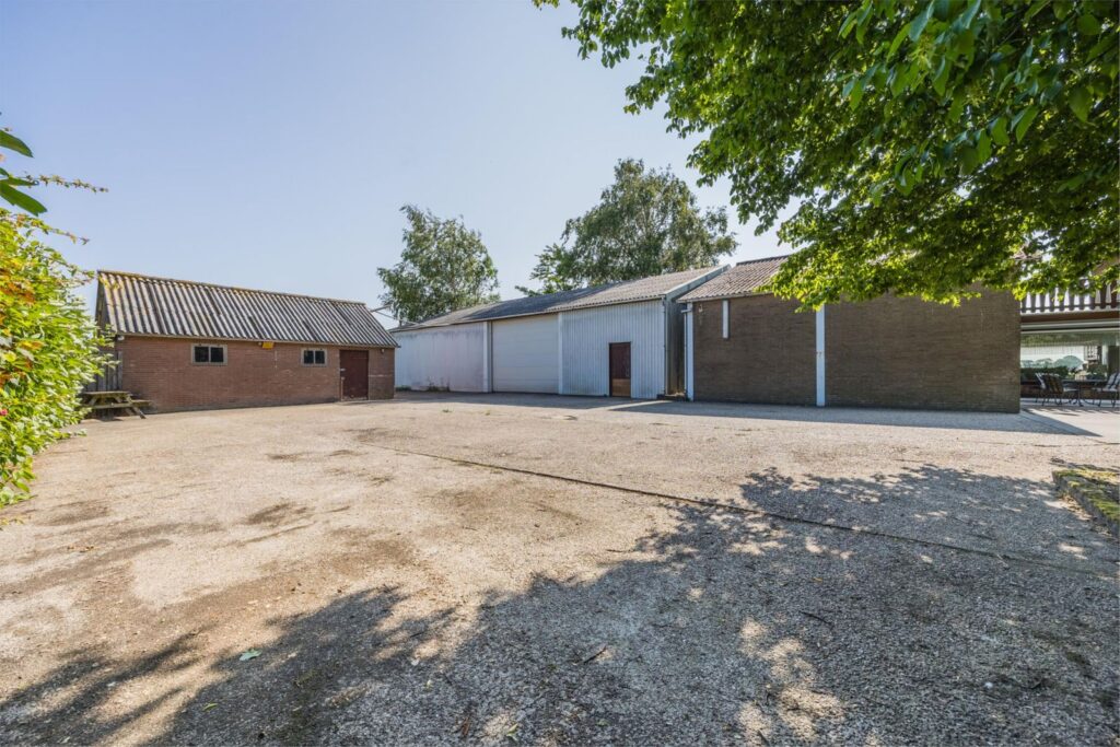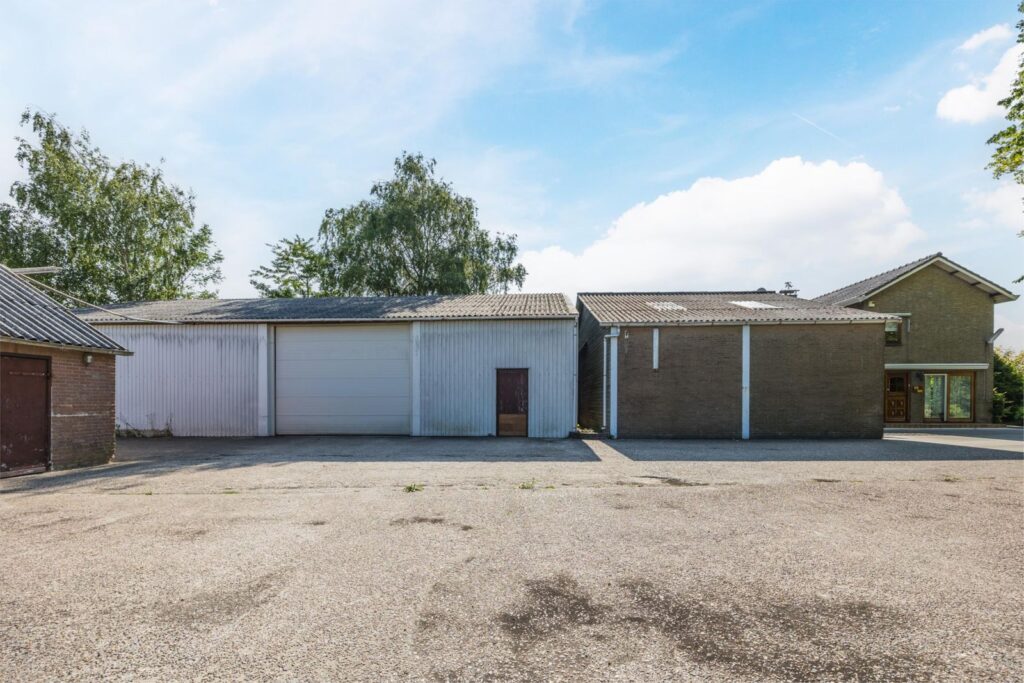 De woning beschikt over een grote schuur/garage met elektrische overheaddeur. Daarnaast bevindt zich achter de woning een ruime loods, eveneens voorzien van een elektrische overheaddeur. Op het terrein is een bovendien een stenen schuur waarin twee paardenstallen zijn gerealiseerd.
