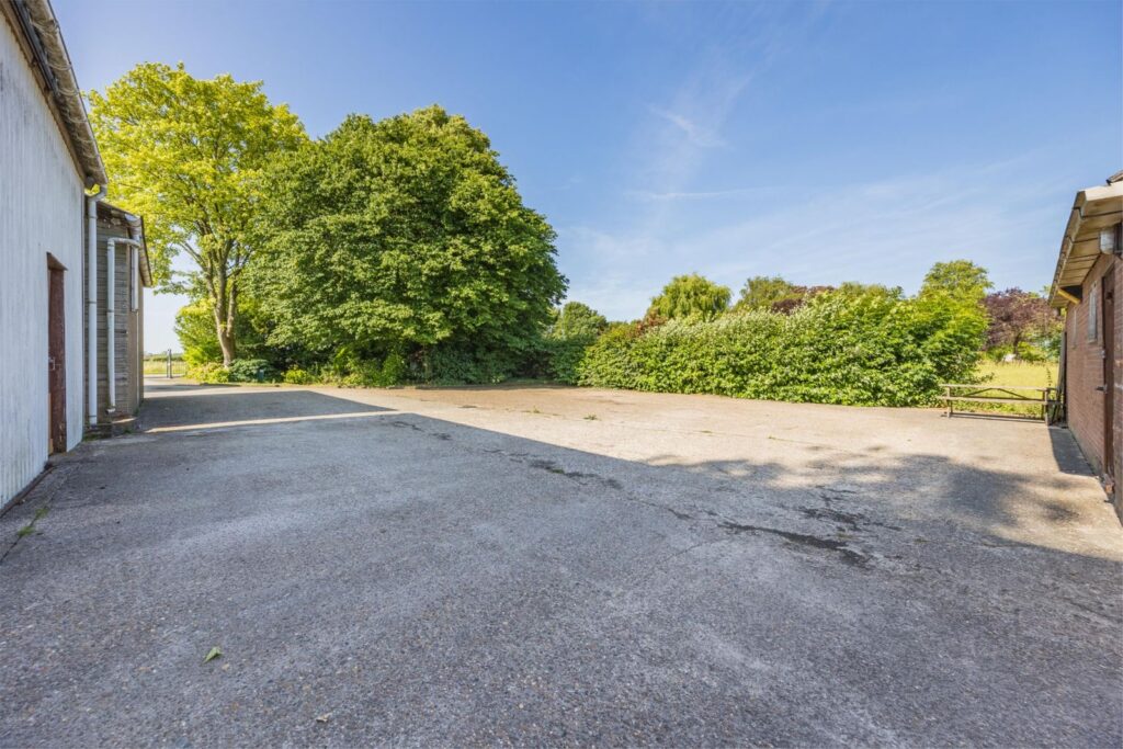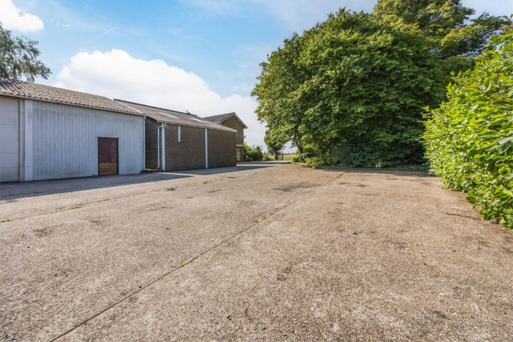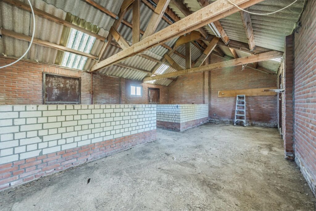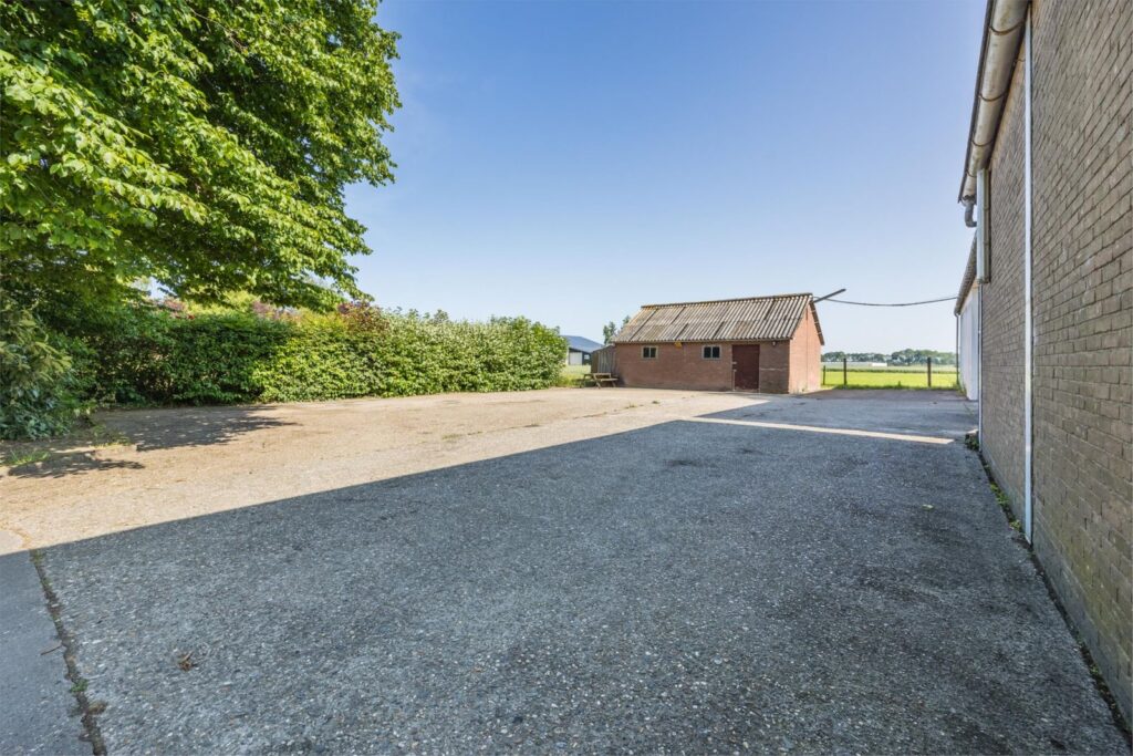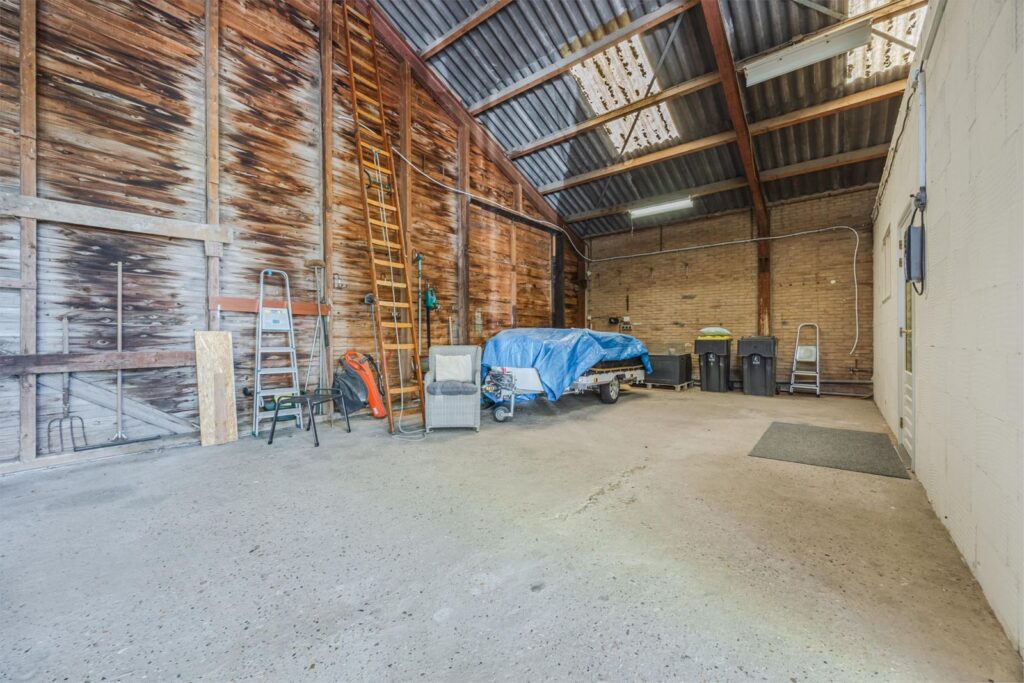 De woning beschikt over een grote schuur/garage met elektrische overheaddeur. Daarnaast bevindt zich achter de woning een ruime loods, eveneens voorzien van een elektrische overheaddeur. Op het terrein is een bovendien een stenen schuur waarin twee paardenstallen zijn gerealiseerd.